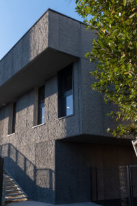 A livello distributivo, l’edificio si articola su un piano terra che accoglie l’ingresso con la reception, la zona lounge (dedicata a momenti di relax), la zona funzionale, la sala corsi e gli spogliatoi, oltre a un’area per l’allenamento all’esterno. In posizioni baricentrica, una scala permette di accedere al piano superiore, dove si trovano la zona cardio, la zona basic e la zona power (sala pesi liberi). in sommità, la copertura piana è adibita a parcheggio, raggiungibile tramite una rampa diagonale, limitrofa all’ingresso della struttura. Il volume, dall’impianto planimetrico irregolare, è caratterizzato da una facciata prefabbricata composta di pannelli di tamponamento termoisolanti in cemento armato, con finitura a effetto pietra a spacco, con successivo trattamento manuale di abrasione acida.