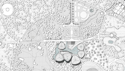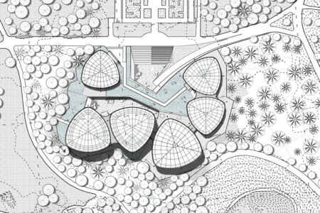 Lo spazio interno è protagonista nella sua relazione dialogica fra i percorsi che si snodano con sensualità e la superficie della pelle trasparente. I camminamenti si sviluppano ad altezze diverse, con delicate variazioni di quota: una promenade architecturale con eleganti cambi di direzioni, di punti di vista – come nella Penguin Pool dello zoo di Londra, di Berthold Lubetkin – e continue sorprese spaziali. Gli accessi principali si aprono sulla piazza-teatro inclinata e scalinata, che dialoga con i volumi eterei dell’architettura. I sistemi di spazi pubblici sono generati geometricamente a partire da un assemblaggio di pentagoni che si giustappongono a formare dinamiche configurazioni spaziali. Pentagoni grigi plasmano anche la pavimentazione esterna, in relazione armonica con gli elementi naturali adiacenti.