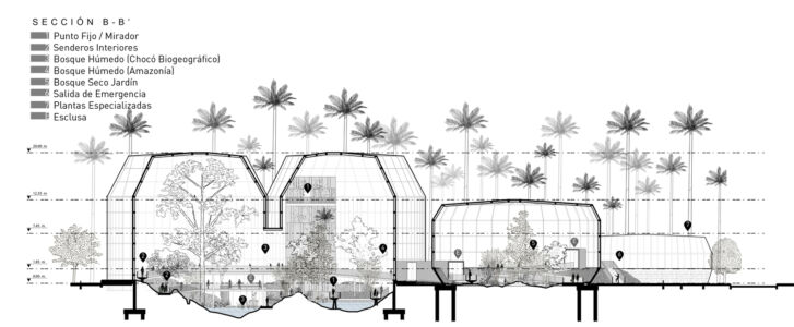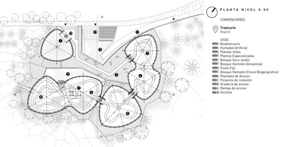 Le diverse aree funzionano come “spazi galleggianti” all’interno di un’estesa zona umida, che simbolizza l’antico ecosistema della savana andina. Il Tropicario ha sei collezioni, corrispondenti a diversi ecosistemi: foresta tropicale secca, umida, collezioni speciali, piante utili, medicinali e brughiera. Ogni spazio – dai requisiti specifici di temperatura e umidità – funziona come modulo “fluttuante”, posizionato su una zona umida artificiale, a reinterpretare gli antichi spazi anfibi dell’ingegneria preispanica d’America, come i Chinampas, i Camellones e le isole galleggianti e fertili destinate all’agricoltura.