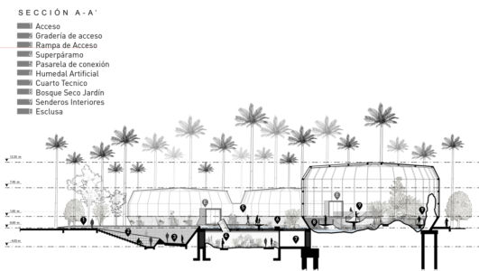 Caratterizzato da un sistema cellulare e modulare che ben si armonizza con lo straordinario intorno naturale, il Tropicario è circondato da un bosco di palme da cera, alte fino a 70 metri. “Era necessario generare”, affermano i giovani progettisti, “un sistema di forme flessibili” che si potesse snodare attorno a questi monumenti naturali. Il nuovo edificio è un sistema fatto di parti correlate, che si assemblano a definire un’unità organica. La sua vocazione educativa e divulgativa, e l’integrazione nel sistema dei percorsi esterni dell’Orto botanico, sono i punti strategici del progetto. A scala territoriale si percepisce una forte relazione con il paesaggio storico della Sabana. “Il nuovo spazio deve insegnare e diffondere i valori e le minacce ambientali del territorio: è un modo per contribuire alla cultura e al rispetto del paesaggio locale”.