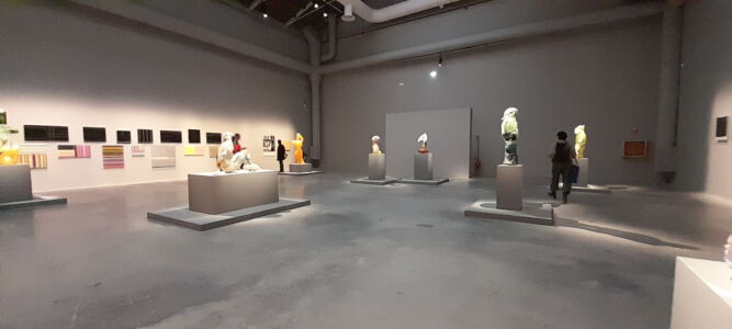 Da qui si diparte un percorso che forza quelli che sono comunque padiglioni che trascinano la loro provvisorietà da decenni a sale di un museo a volte sovrallestito. Luci sagomate su pareti grigie d’ordinanza, che va sempre bene e non impegna, portano a scoprire nel seminterrato una capsula del tempo – approfondimenti in numero di 5 sparsi fra Giardini e corderie che offrono un viaggio transtorico per una rilettura a tesi della storia dell’arte – che è un tuffo nei favolosi Seventies con moquettone simil oro a risvoltare sulle pareti super ocra per accogliere vetrinette con opere in ombra e fluorescenti dalla luce livida. Spontaneo l’interrogativo: l’atmosfera da vecchio museo di provincia è giustificata per rendere più vera la narrazione storica? Tralasciando didascalie e testi, che spesso si accaniscono contro il visitatore, ci si avventura fra i padiglioni nazionali.