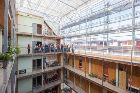 In un contesto come quello descritto, La Borda ha anche il merito di essere tra i primissimi progetti con queste caratteristiche realizzati su suolo pubblico. Un modello che il Comune di Barcellona ha accolto come progetto pilota convertendolo in prassi con tanto di concorsi: attualmente sono una decina i progetti in corso di realizzazione. Vicini alle idee e alla politica sociale promossa da Ada Colau, grazie alla doppia legislatura della sindaca, Lacol ha potuto contare su un alleato che non ha messo i bastoni tra le ruote al progetto difeso dal collettivo. Con i suoi 25 metri di altezza, La Borda è l’edificio più alto di Spagna realizzato con una struttura interamente in legno. Una settantina gli inquilini, che occupano 28 alloggi in tagli da 40 a 78 mq. Liberato dagli standard imposti dalla logica di mercato che non consente una personalizzazione degli spazi, il processo progettuale va oltre la mera formalizzazione di un programma. L’ampio patio centrale con i ballatoi, la cucina, la lavanderia e la sala riunioni al piano terreno sono spazi comuni accessori pensati per favorire gli scambi tra gli abitanti. Fondamentale anche la ricerca di soluzioni sostenibili e per l’ottimizzazione dell’uso dell’energia, risolte attraverso orientamento, copertura del patio centrale e sistema di ventilazione: questi sono solo alcuni degli accorgimenti che consentono un risparmio del 20% sulla bolletta dell’elettricità di ogni nucleo abitativo. La scommessa di un edificio bioclimatico a gestione attiva ha portato i suoi frutti, consentendo una riduzione generale del 30% di energia primaria totale e del 76% di emissioni di CO2, ma le misure adottate sono in divenire, costantemente monitorate dalla cooperativa.