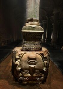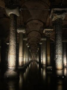 Yerebatan Sarayi, in lingua turca, fu costruita nel 532 dall’imperatore Giustiniano come cisterna per raccogliere l’acqua dall’acquedotto di Valente. Dimenticata per quasi mille anni, solo nel 1555 fu riscoperta dal viaggiatore olandese Petrus Gyllius. Da allora il “palazzo sommerso” è divenuto un monumento. Interessante è l’evoluzione dei sistemi di visita nel corso dei secoli, dalle barchette con lampada a petrolio fino alle passerelle in cemento armato e alle luci generatrici di lampenflora. L’opera, restaurata più volte a partire dal 1723, aperta al pubblico nel 1987, è tra i monumenti più visitati di Istanbul. Nel 2018 è stato avviato un ulteriore restauro, terminato nel 2022, che ha compreso il consolidamento dei tiranti delle volte, delle murature e l’illuminazione. I lavori sono stati progettati e diretti dagli studi Atelye 70 (Istanbul), Insula Architettura Ingegneria (Roma) e Studioillumina (Roma).