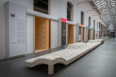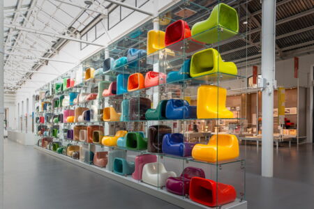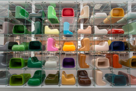 Il percorso si conclude con una grande e suggestiva libreria in vetro che ospita le 100 poltroncine Jumbo in 100 differenti colori, scelti da 10 importanti studi di architettura internazionali (Massimiliano & Doriana Fuksas, Marti Guixé, Toshiyuki Kita, Mauro Lipparini, Park Associati, Portman Architects, SITE James Wines, storagemilano, S20M Antonio Ventimiglia, Carlos Zapata). Le poltrone, originariamente realizzate in vetroresina, ora vengono riproposte in fibra di basalto, materiale ecologico e riciclabile. Peccato che l’allestimento, molto suggestivo e fotogenico, non sia visibile fin dall’ingresso, sacrificato com’è al fondo del percorso.