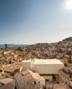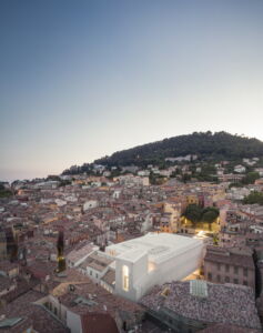 Recentemente, la mediateca Charles Nègre, progettata dagli architetti Emmanuelle e Laurent Beaudouin con Ivry Serres, ha instaurato un dialogo fertile inscrivendo la quiete di un’architettura contemporanea di rara potenza. Nutrito dalla sostanza della città e da sottili echi vernacolari, l’edificio s’ispira al rapporto tra i monumenti e il tessuto urbano di Grasse per affermarsi come luogo da cui contemplare l’abitato e il suo paesaggio scosceso. Dominata dalla sagoma di una nuova torre belvedere, la mediateca si affaccia sul mare e sulla città vecchia dall’alto della sua terrazza. Attingendo alle fonti della struttura urbana, l’opera crea tensioni, attriti e vicinanze. In contrappunto, rinnova le aperture visive sul quartiere e sul paesaggio più distante.