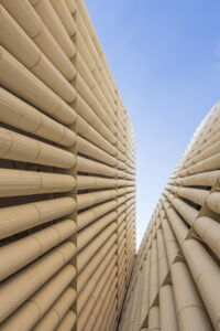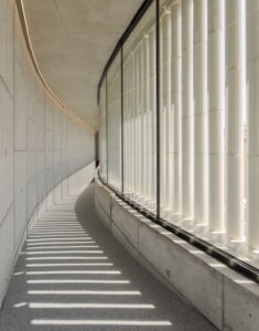 Sin dall’ingresso, dove un varco di luce attraversa i livelli superiori, la mediateca seduce con la bellezza dei suoi spazi limpidi, permeabili alla luce e freschi d’estate. Il filtro delle colonne scanalate in cemento bianco dell’involucro a sei livelli scherma la luce naturale e questa variante su larga scala del claustra provenzale protegge la facciata in vetro incassata. Sopra la reception, le sale lettura a due piani offrono una panoramica degli spazi interni. La facciata, le opzioni energetiche e i materiali utilizzati nell’edificio fanno parte di un approccio ecocompatibile.