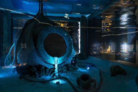L’impiego di strumenti multimediali rende “acquatico” il pavimento, “sponde” le pareti e anima dei riflessi mobili di vetrine e reperti il soffitto. L’allestimento multimediale (Studio Azzurro, HGV Italia) si fa così complice di quello scientifico, facendo assumere al percorso un significato quasi iniziatico-simbolico, di una discesa catartica, appunto. Più che approssimarsi, sembra proprio di scorrere, trasportati dal flusso, verso gli oggetti esposti. Una studiata prossemica consente al visitatore varie distanze di godimento dai reperti, in un calibrato rapporto fra l’insieme e il dettaglio. Puro godimento estetico, una studiata strategia luministica cerca effetti di contrasto dall’accostamento dei colori complementari blu/arancio: il blu dei fondali ricreati, l’arancio della luce calda che riporta in vita i reperti.
