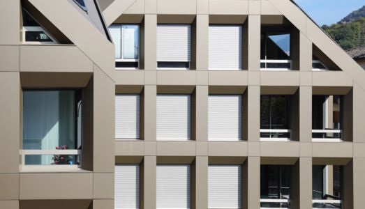 Un involucro edilizio, con facciata ventilata realizzata da Alpewa, riveste l’intero immobile con una griglia regolare di fasce orizzontali e verticali che racchiude entrambi i volumi senza soluzione di continuità, incorniciando portici, logge, finestre e terrazze a tasca. La nuova facciata, così strutturata, permetteva all’interno di poter avere un’infinità di soluzioni e variazioni che non avrebbero compromesso l’aspetto dei vari prospetti. L’aspetto scultoreo si è poi palesato nel momento in cui si è deciso di tagliare gli angoli del tetto e di omologare la struttura allo skyline esistente fatto di case con tetti spioventi e profili montuosi in lontananza.