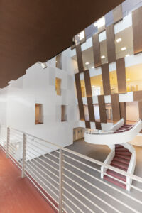 L’edificio si presenta come un volume puro le cui facciate sono caratterizzate da un disegno continuo di bucature orizzontali interrotto in corrispondenza degli ingressi sui due prospetti principali. Internamente le funzioni principali sono collocate al pian terreno intorno a un vuoto centrale per favorire la configurazione di una piazza interna. Ai piani superiori il vuoto centrale è circondato da un sistema di percorrenze che serve i laboratori e le aule.