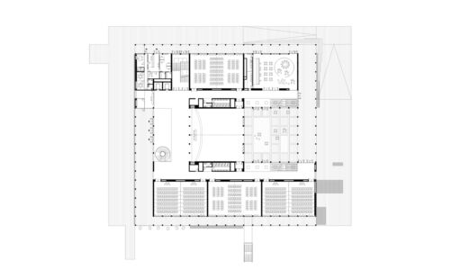 L’edificio è strutturato secondo uno schema ibrido che nasce dalla sovrapposizione di una struttura lineare – alternanza di pieni e vuoti – con il modello a corte. Il risultato è uno schema che prevede due profonde fasce lungo i fronti sud e nord, dove si trovano principalmente le aule, mentre i fronti est e ovest corrispondono al “vuoto” centrale, nel quale si collocano gli ambienti principali (atrio, aula magna, cortile). Il sistema di portici che ne connota l’esterno è riconducibile a un più ampio sistema figurativo che regola i diversi interventi previsti dal masterplan generale.