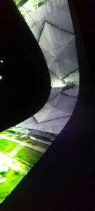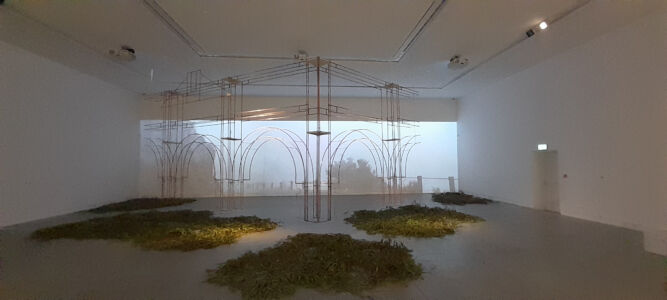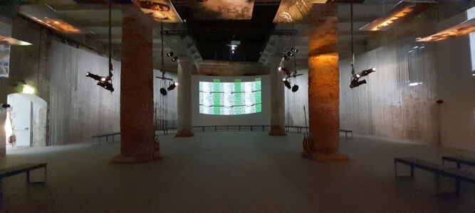 Strabordante l’uso del multimediale. L’audiovideo, preferibilmente nelle sue forme video-proiettate e poi in grandi monitor, è adottato quasi come una prescrizione medica alla quale si obbedisce diligentemente. Forma di comunicazione principe, sembra che ogni tipo di allestimento, parete decorata, installazione spaziale, tessitura con nuovi materiali, e sperimentazioni microstrutturali, tutto debba essere cornice e sfondo per lo schermo/proiezione ipertecnologica che narra, fa narrare, illustra, immerge, stupisce, circonda. La crasi fra sensibilità ecologica, sostenibilità, riequilibrio politico, sociale, economico e l’utilizzo dei mezzi messi a disposizione dal discusso antropocene, è lampante.