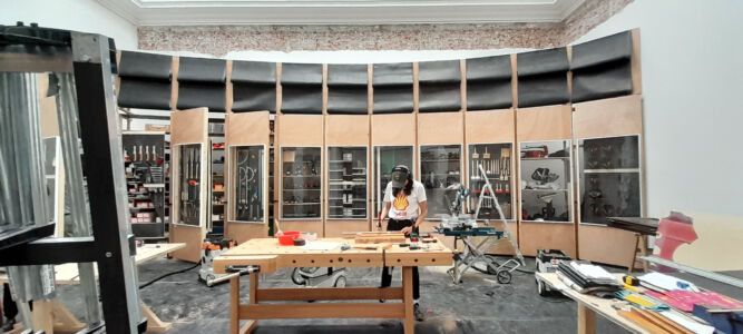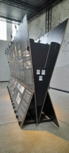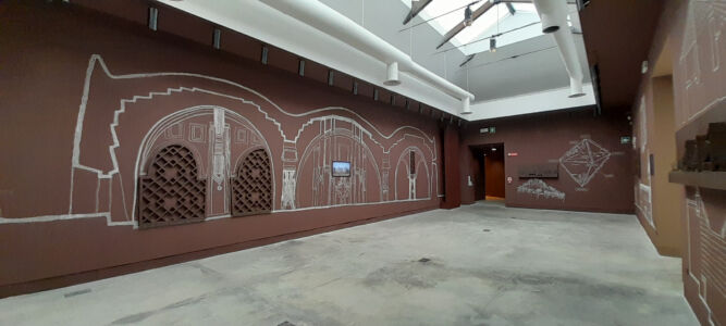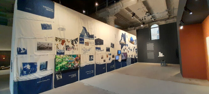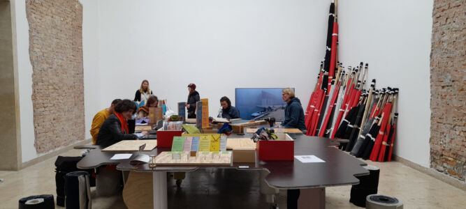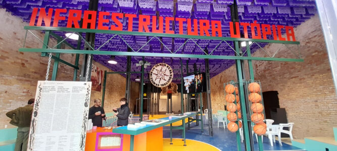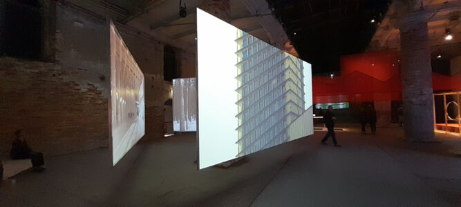 Il processo di sostanziale sovrapposizione della Biennale di Architettura con la sorella maggiore d’Arte si ritrova puntualmente espresso anche negli allestimenti e nelle modalità di comunicazione. Al di là delle evidenze macroscopiche, la distribuzione degli spazi e le partizioni utilizzate nel 2022 alle Corderie dell’Arsenale nell’edizione curata da Cecilia Alemanni sono rimaste tali e quali quest’anno, l’Architettura sembra sempre più rinunciare a mostrare progetti, proposte, visione, in favore di rappresentazioni antropologiche, sociali, economiche e politiche che non vanno molto al di là dell’analisi, se non nell’enunciazione di processi riparatori e di dichiarazioni d’intenti. In questo senso l’allestimento perde addirittura i suoi autori – nel colophon generale non compare neanche la voce – e la resa spaziale assume i modi dell’installazione, peraltro già a lungo esplorati, e della resa grafica e, ancora meglio, multimediale, d’idee ed ideologie. Segno e significante sono sempre più sovrapposti con una chiara volontà che parte dal contenuto per dettare la forma: allestimento ideologico, potremmo dire.