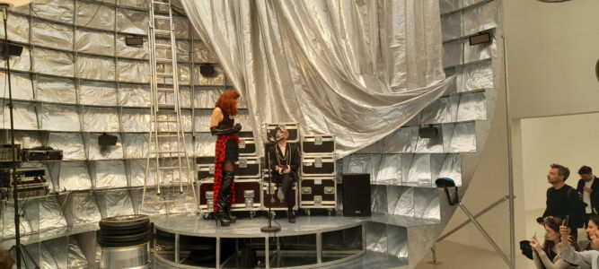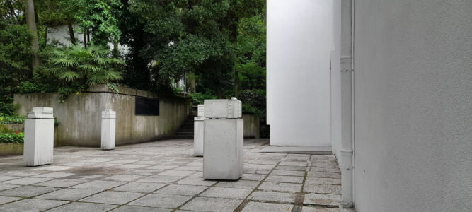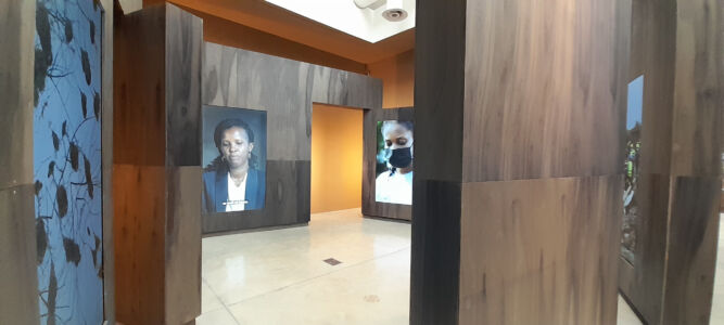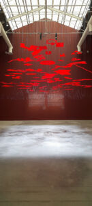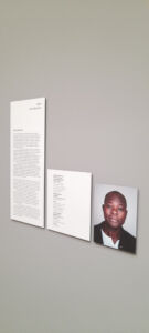 Si nota la presenza costante del ritratto degli autori/autrici perché le installazioni devono avere un nome, una spiegazione, ma soprattutto un volto. Non sappiamo quanto questa scelta sia frutto di una volontà di completezza di comunicazione o per dare una precisa collocazione somatica. La scelta di grandi testi prespaziati in argento su fondi di vari colori si presenta spesso illeggibile e, francamente, irritante nel costringere il lettore a contorsionismi per spostarsi alla ricerca di un giusto riflesso che permetta l’intelligibilità. Piacevole è, invece, l’essere tornati a mettere prima testo italiano e poi quello inglese, crediamo dovuta nel caso del paese ospitante, ma forse anche da intendere come attenzione verso una minoranza linguistica.