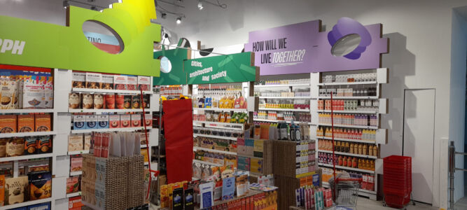 L’approccio scenografico, teso a disegnare luoghi per performance, è meno utilizzato e, in questo, risiede la più grande differenza con l’Arte, soprattutto dell’ultima edizione. Il genere non è comunque privo di estimatori: la Francia realizza un teatro sferico ove i colloqui degli attori sulla scena proseguono con il pubblico nel camerino, attrezzato come un grande bodoir con tavolone di conversazione. Simile l’approccio della Gran Bretagna, che affida la comunicazione a un teatro multimediale che costringe il pubblico a sedersi su uno scomodo pianetto inclinato curvo e allestisce il resto del padiglione come una mostra d’arte. Al prezioso padiglione del Canada, progetto BBPR 1956, va in scena una sorta di cantiere/occupazione, tutta grafica all’esterno, manifesti e tavoli con opuscoli all’interno e compare pure una bomboletta spray rossa a disposizione per stencil di protesta. I Paesi Nordici, che posseggono uno dei più bei padiglioni che l’architettura moderna abbia mai prodotto, quello di Sverre Fehn, mettono in scena un mercatino sami fatto di tronchi-pelli-libri-manufatti vari che rafforza la nostra simpatia verso gli amici lapponi, ma non verso l’uso che hanno fatto degli spazi. L’Estonia si affida a una “scenografia vera” utilizzando un delizioso appartamento sul canale del Ponte dei sospiri all’uscita dell’Arsenale per raccontare storie domestiche. Il Messico costruisce un mezzo campo da pallacanestro, che vuole raccontare storie di inclusione sociale ma produce un rumoroso ambiente di palestra. L’Ucraina, orgogliosamente presente, affida a un telo scuro il coprire una realtà che comunque si manifesta nella sua crudezza senza rinunciare a un progetto per il futuro. La Santa Sede allestisce nell’abbazia di San Giorgio un orto per l’amicizia sociale, introdotto dalle sculture di Alvaro Siza, ove si apprezzano le intenzioni. L’Australia fa i conti con la propria storia facendo galleggiare su un letto di Eucaliptus una sagoma di architettura in tubo di rame, a rappresentare le molte Queenstown nazionali. Nella Polonia i data prendono la forma di layer metallici colorati che configurano un reticolo percorribile non senza una dimensione ludica. Ma il premio della categoria va alla Lettonia, il cui piccolo padiglione è allestito come un supermercato dove i prodotti sugli scaffali sono sagomette di cartone che rappresentano i vari paesi nelle ultime edizioni con tanto di titolo e logo. Allo spettatore viene data una pallina antistress e il compito di scegliere i tre prodotti/paesi preferiti e, di conseguenza, imbucare con un plastico lancio la pallina nell’apposita bocca predisposta sulla sommità degli scaffali. Più facile a dirsi che a farsi, il pubblico verrà poi premiato con uno scontrino che riporta le preferenze espresse, mentre la pallina si raccoglierà ai piedi di ogni edizione e, fra sei mesi, permetterà di stendere una classifica che nessuno, neanche i curatori, sa bene a cosa porterà. Il premio va per la scenografia, per l’interattività umana, per l’assenza di tecnologia audiovideo, per la grafica che costruisce l’allestimento, e per il sorriso che l’attività ludica porta in Biennale.