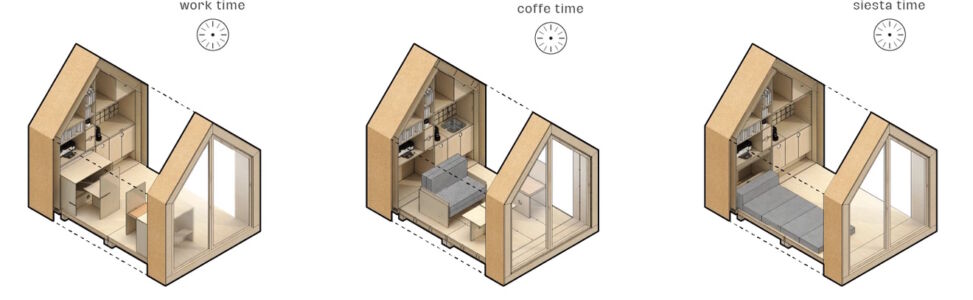 Juan Ruiz e Amelia Tapia, architetti ecuadoregni, hanno realizzato nel 2023 una struttura flessibile che consente di ampliare la superficie abitativa ogni volta che nascesse l’esigenza. Iwi è una struttura modulare che, una volta estesa al massimo, offre 9 mq di spazio, mentre chiusa si riduce a soli 2 mq. La caratteristica principale di questa micro-cabina è il meccanismo pieghevole “a soffietto” che permette di ricavare un’intera nuova area abitativa in pochi minuti. La soluzione tecnologica infatti consente di comprimere e allungare i moduli (uno anteriore e uno posteriore) collegati tra loro con tessuti, configurando una struttura simile a quella di una fisarmonica. I moduli sono realizzati in legno di cipresso e isolati in sughero e lana di pecora. All’interno trovano posto un piccolo spazio ufficio e un angolo cottura.