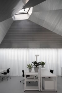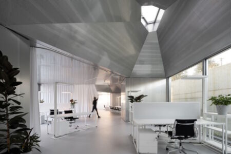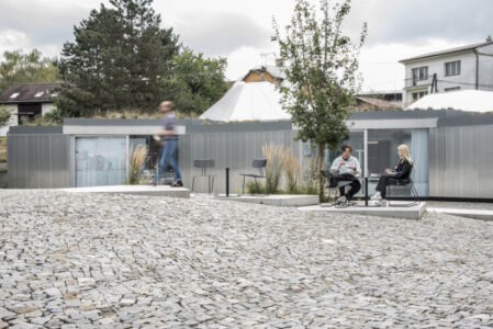 Chybik + Kristof (studio di architettura e design urbano fondato nel 2010 da Ondrej Chybik e Michal Kristof) e Koma (produttore di edifici modulari) hanno concepito un centro di ricerca sperimentando un uso innovativo delle strutture modulari. Completato nel 2022, esso risponde ad alcuni requisiti per la comunità locale, proponendosi al contempo come think tank per l’elaborazione di nuove possibilità per gli edifici modulari stessi. Il concetto di ampia trasparenza diventa una soluzione innovativa, finalizzata a sottolineare il carattere di accessibilità grazie all’assenza di barriere architettoniche. Ultimo di tre progetti modulari (che hanno analogamente visto coinvolto il team di progettazione e il produttore), il manufatto declina il concetto dei container ruotati che funzionano come colonne, realizzando uno spazio architettonico malleabile che espande ulteriormente la nozione stessa di architettura modulare. Il prototipo ambisce infatti a definire alcuni principi che indicano la direzione di una possibile evoluzione: oltre alla trasparenza, la flessibilità d’uso, la creazione di una nuova forma che offre una modularità illimitata e rivela un sistema innovativo di forme modulari multifunzionali, la funzione a servizio della comunità. Con tre elementi modulari principali – il pavimento, il contenitore e le unità di copertura – lo spazio composto definisce un nuovo sistema nel quale le unità spaziali contenenti le strutture funzionano come colonne. Tra i container e la copertura, vaste superfici vetrate lasciano filtrare un’abbondante quantità di luce, mantenendo l’ambiente di lavoro aperto e collegato allo spazio esterno. La giustapposizione dei moduli principali e delle superfici vetrate forma un’ampia area aperta dedicata a spazi di lavoro orizzontali e verticali. L’area stessa è completamente flessibile, evitando però gli aspetti negativi dei grandi uffici open space, e può essere riadattata, formando molteplici postazioni di lavoro adattabili e individuali.