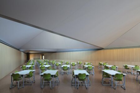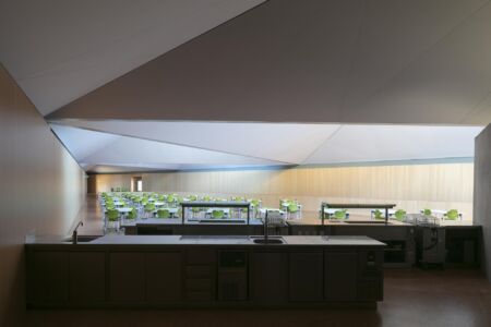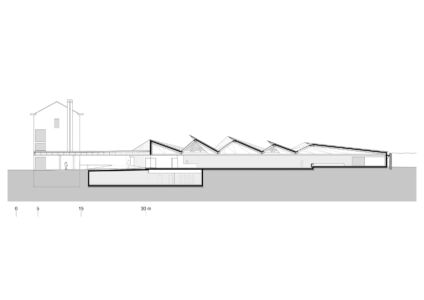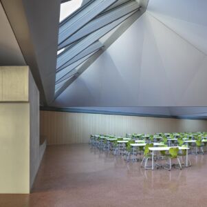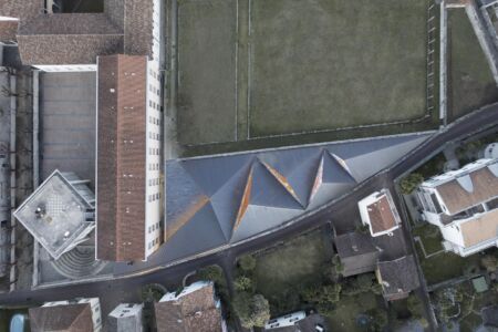 La copertura diventa il tema attorno al quale viene concepito il progetto. La sfida è di coprire lo spazio lasciandolo libero da strutture portanti intermedie. Le travi di metallo reticolare dividono in spicchi triangolari il cielo della mensa, poggiando sui muri in cemento armato eretti dietro ai muri di pietra. L’esito spaziale del rammendo diventa sorprendente quando ognuna delle travi triangolari viene sollevata e fermata dalle falde. La luce penetra da nord e invade l’aula.