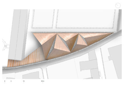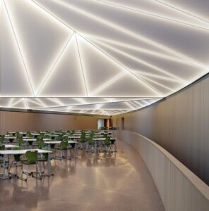 Di notte si accendono le falde disegnate da una trama, anch’essa triangolare di led, che riproduce il reticolo della struttura portante di metallo. Il tessuto che confina lo strato d’isolamento del tetto nasconde i corpi illuminanti, il cui chiarore si diffonde lungo la superfice del tetto, conseguendo un effetto opalino.