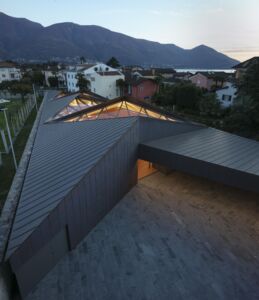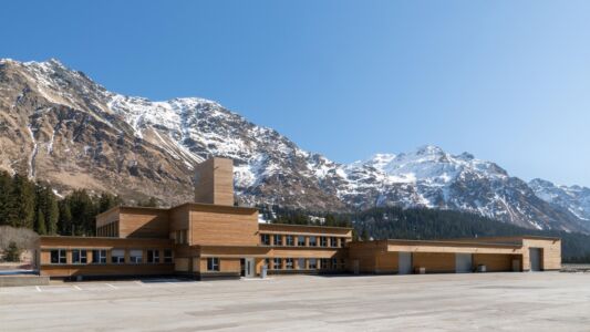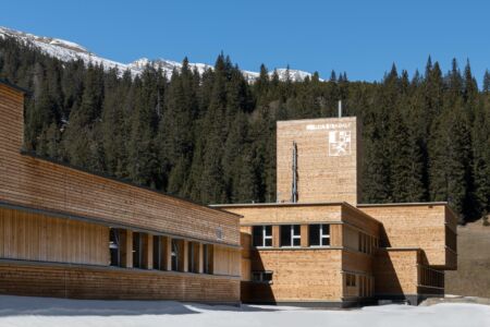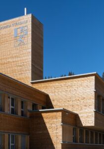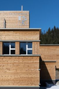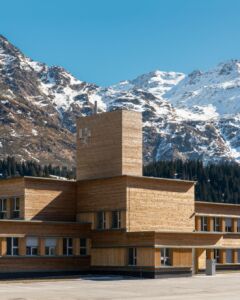 Il lungo ampliamento verso sud dell’edificio viene sapientemente concluso con una copertura più elevata, rivelando la capacità dei progettisti di controllare in modo preciso e colto una composizione così complessa. L’esito finale dell’intervento è anche quello di avere liberato l’edificio preesistente dal carattere un po’ triste e “poliziesco” che lo caratterizzava, radicandolo nello splendido paesaggio tra le cime innevate.