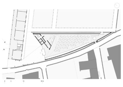 L’ingresso alla mensa è collocato nel lato corto del triangolo ed è protetto da una tettoia, la cui altezza interna è limitata in modo da ottenere la compressione necessaria per introdurre alla sorprendente spazialità dell’aula. Tutte le attività di servizio sono dislocate al piano interrato, il cui accesso è risolto da una lunga rampa che corre lungo il lato esterno e curvilineo dell’aula. L’unica apertura nel muro perimetrale, dalla quale si traguarda il lago, è una piccola bucatura collocata dove un tempo c’era una porta.