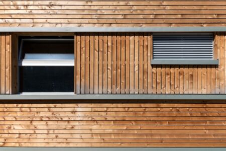 A San Bernardino, l’edificio preesistente degli anni settanta era rivestito in lastre di eternit e scarsamente isolato. La vecchia pelle viene sostituita con una struttura in legno composta da pannelli modulari isolati tipo “sandwich” e successivamente rivestita da doghe di larice, il cui criterio di posa per fasce mira ad accentuare l’orizzontalità dei fronti. Nella fascia dei serramenti le doghe sono verticali, mentre nella fascia piena (tra una fila e l’altra degli stessi) esse sono orizzontali. L’effetto stratificato è ulteriormente accentuato dai profili in lamiera di zinco ossidata, che riprendono il filo dei davanzali e dei cielini delle bucature, e che servono anche da gocciolatoi a protezione della facciata. Questi profili lineari avvolgono orizzontalmente tutte le articolate parti dell’edificio, legandole fra loro e conferendo all’insieme un effetto di stabilità e calma, contrapposta alla rumorosa dinamicità dell’autostrada.