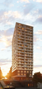 Sono molti gli aspetti vantaggiosi di questa tecnologia che, anche nell’ambito degli edifici alti, negli ultimi anni prende sempre più spazio all’interno del sistema delle costruzioni a partire dagli aspetti climatici: basti pensare che ogni metro cubo di legname da costruzione trattiene una tonnellata di CO2 per un lungo periodo di tempo. L’innovazione nel processo di progettazione e costruzione permette di realizzare edifici con grande velocità grazie alla prefabbricazione. La torre Roots sta dimostrando quanto rapidamente si possa realizzare un edificio residenziale, con finiture di alto livello, in poco tempo. Ad esempio, il montaggio in loco delle facciate prefabbricate è notevolmente più breve (se paragonato ai sistemi tradizionali), al punto da apparentare l’opera a una costruzione in lego. Non trascurabile anche il fatto che i componenti in legno sono più leggeri rispetto ad equivalenti in cemento o acciaio; di qui la richiesta di fondazioni più piccole, che consentono di risparmiare spazio, risorse e costi. In ultimo, le costruzioni in legno comportano zero sprechi: ogni singolo elemento viene completamente utilizzato nella lavorazione, ma può essere poi smontato e riutilizzato.