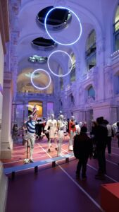 PARIGI. I cinque cerchi campeggiano luminosi e colorati, nella grande sala della mostra “Mode et sport, d’un podium à l’autre” al Musée des Arts Décoratifs (fino al 7 aprile), posti quasi a consacrare la distesa di manichini che, collocati sul piano sottostante, indossano le meraviglie che la moda francese ha pensato lungo i decenni per permettere la pratica sportiva con classe, gusto, eleganza e innovazione.