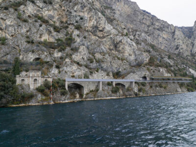 Prendendo il tratto di Limone come campione al vero dell’intera opera nell’alto lago, è indubbio che l’impatto sul paesaggio sia incisivo; certo, forse è il luccichio delle strutture in acciaio inossidabile a catturare l’occhio in una vista ravvicinata. Elementi metallici messi a sottolineare punti sensibili: un piercing territoriale, rappresentativo dell’estetica contemporanea. Una prospettiva più allargata porta però a valutare con maggior distacco questo sottile nastro. Ciò che risulta ben percepibile, nel profilo della costa – ma qual è il punto di vista da considerare, quello di un natante? – sono le strade, con la sequenza di pieni e vuoti, di gallerie e strutture di protezione (alcune recenti e molto impattanti, probabilmente perché realizzate in emergenza). Elementi oramai ben storicizzati, dato che la loro costruzione risale ai primi decenni del secolo scorso: la Gardesana occidentale venne inaugurata nel 1931 e battezzata da Gabriele D’Annunzio “Il Meandro”, con riferimento al suo andamento sinuoso. Giudicato col metro contemporaneo, però, il suo impatto risulterebbe improponibile: perché non continuare ad andare via acqua come sempre, si sarebbe detto?