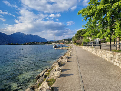 Nel basso lago le condizioni al contorno sono a loro volta differenti: le passeggiate lungo i bordi rimangono riservate ai pedoni e si lavora a mettere in sicurezza per i ciclisti i tratti di carreggiata stradale più interni. Così è stato fatto tra Peschiera e Pacengo, e ora si proseguirà fino a Lazise; altrove, come a Bardolino, il percorso risalirà più marcatamente nell’entroterra per aggirare il centro abitato, e situazioni analoghe si prospettano nella sponda bresciana, ad esempio tra Gardone Riviera e Toscolano Maderno, mentre verso sud il progetto approvato prosegue la sua corsa bordo lago fino a Padenghe.