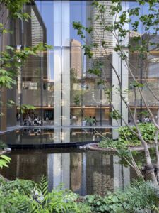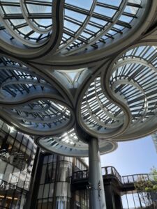 Gli spazi esterni plasmati dallo studio londinese sono prevalentemente caratterizzati da ampie arcate curvilinee in cemento armato a finitura granulosa, che inquadrano vetrate e infissi color ottone, dal calibrato contrasto cromatico. Perfettamente realizzate, seppur visivamente pesanti e talvolta poco dinamiche, le arcate danno forma all’idea della “collina in città”, facendosi traino strutturale per gli oltre 24.000 mq di verde che animano gli spazi pubblici e i percorsi esterni. Come sottolineato dai progettisti, si coglie l’invito all’esplorazione attraverso ricercate connessioni tra visitatori e architettura, seppur sempre circondati da negozi e ristoranti. La collina si fa quindi avamposto e stratagemma per accompagnare il pubblico verso la sorprendente piazza centrale (oltre 6.000 mq), che funge da ingresso al centro commerciale e alla Mori JP Tower.