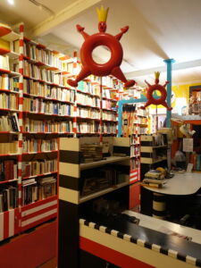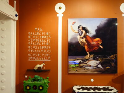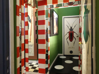 Oggetti dalle forme sorprendenti e dai colori squillanti rimodellano lo spazio e dialogano con ceramiche policrome e mobili in stile, reinventati da imprevisti contrasti cromatici. Gli spazi s’inanellano e dissolvono la dimensione lineare dell’architettura domestica, sostituendola con quella frammentaria e labirintica del bosco. Il crescendo di oggetti, di epigrafi enigmatiche, di figurazioni sconcertanti deflagra nell’effetto Alice in Wonderland. Schermi fluorescenti, statue dorate, pannelli dipinti, macchine celibi e pittogrammi al neon compartiscono le pareti, che si confondono con pervasive librerie dai montanti a strisce rosse e bianche, che istituiscono inaspettate partizioni spaziali.