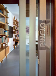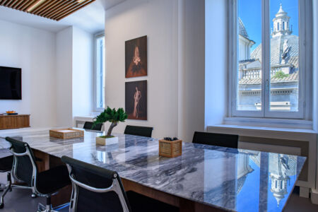 L’intervento dialoga con il contesto storico ma, al contempo, cerca in qualche modo di dissacrarlo. Gli ambienti sono popolati da quadri e sculture, tra le quali spiccano le teste e i busti di vari colori clonati da artficial™. Le opere, scelte e collocate dai progettisti di concerto con la committenza, provengono da due gallerie romane (Studio SALES e SUarte) e potranno essere sostituite nel tempo, trasformando lo studio in un vero e proprio spazio espositivo. Nella reception, la testa di Antonia Minore è colorata con la tonalità di arancione che identifica il brand LCA. Il basamento su cui poggia è stato realizzato recuperando i piani di lavoro in legno sui quali viene tagliato il marmo, così come il tavolo della sala riunioni principale. Le porte interne, conservate in quanto elementi di pregio, sono state sottoposte a un semplice intervento di make up, con l’inserimento di nuove maniglie in ottone, materiale scelto anche per la rubinetteria di cucina e bagni. Tutti gli ambienti sono unificati dalla stessa pavimentazione continua di tonalità grigia, che richiama le cromie delle porte e degli elementi di arredo che celano i fancoil, prodotti su disegno. A questo pavimento freddo fa da contrappunto un soffitto caldo, realizzato in maniera artigianale con doghe in legno massello, tra le quali sono interposte barre luminose. Fanno eccezione la zona relax nella reception e l’area ristoro, illuminate da lampade a sospensione costituite da una barra circolare. Seminascosta da una parete di doghe verticali in legno e dotata di una piccola cucina, si trova l’area ristoro.