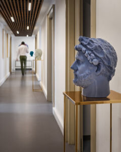 Opere d’arte contemporanea, arredi in legno di recupero e cloni di antiche statue realizzati in fibra di mais con colori vivaci: gli spazi della nuova sede dello studio legale LCA a Roma propongono una versione pop e green della scultura classica, a rispecchiare l’identità giovane e dinamica della committenza. Disegnata da GESIDI Engineering Architecture e situata in piazza del Popolo, la sede romana è l’ultima aperta da LCA, che ha il suo quartier generale a Milano, con uffici a Genova, Treviso, Bruxelles e Dubai. A Roma, gli uffici si trovano all’interno di un palazzo che, insieme alla cosiddetta Chiesa degli Artisti (la basilica di Santa Maria in Montesanto), è gemello della chiesa e del palazzo sul lato opposto della piazza, ideata da Giuseppe Valadier a inizio Ottocento.