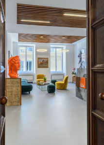 Realizzato nel 2024, il progetto d’interni (800 mq al terzo e penultimo piano) ha riguardato in particolare gli ambienti comuni: reception, due corridoi di distribuzione, quattro sale riunioni e area ristoro. Sul palazzo sono presenti vincoli di tutela, che interessano sia gli esterni che gli interni. Tuttavia, mentre le facciate conservavano il loro aspetto originario, gli interni sono stati rimaneggiati nel tempo.