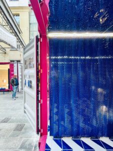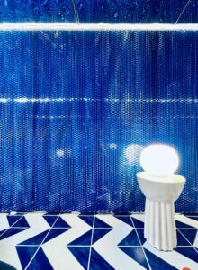 All’interno di un modulo navale standard da 20 piedi, Enrietto crea un ambiente immersivo dove materia e luce si fondono, evocando un paesaggio liquido. Fondamentale alla riuscita di questa trasformazione è stato il contributo di Alpewa, che ha fornito tre materiali chiave.