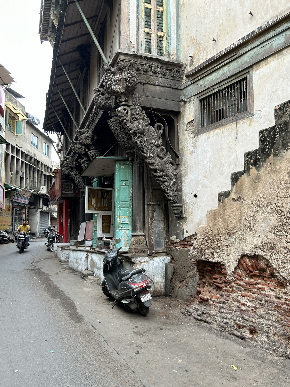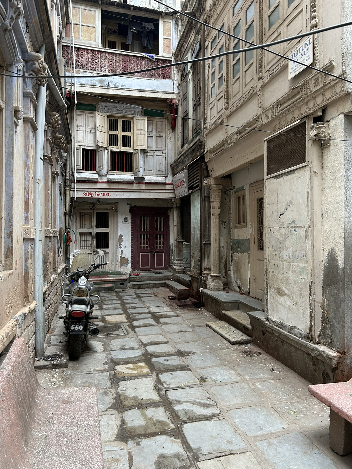 Che questa città dell’ovest indiano stia scalpitando per assicurarsi un posto nel miracolo economico indiano, lo si può intuire mentre ci si muove tra il Sarkhej Roza e il centro storico (Patrimonio UNESCO dal 2017). La metropoli cresce e si riorganizza: angusti e precari agglomerati urbani vengono demoliti per lasciare spazio a trafficate strade costellate da enormi statue propagandistiche, nuovi complessi residenziali e ristrutturazioni. Il centro, fortunatamente, resiste a queste pressioni. I vincoli patrimoniali e la densità abitativa tengono lontani gli investitori, e tra i vicoletti si possono ancora ammirare i pol, tipici cluster abitativi dove, dietro facciate finemente decorate e intorno a una corte, si riunivano le famiglie in base alla loro casta.