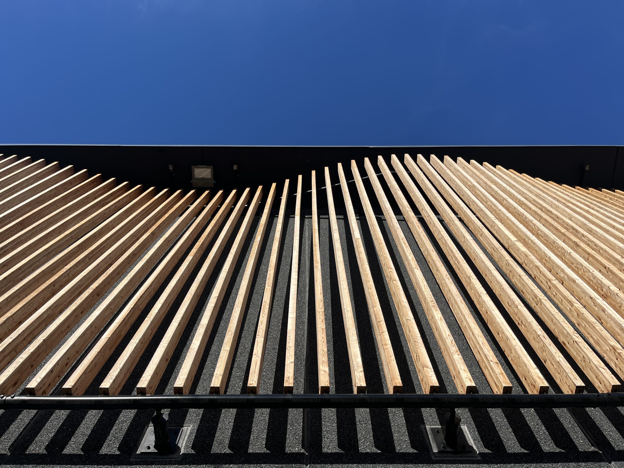I graticci in legno e le onde generate dai listelli in facciata – così riconoscibili dall’autostrada – sono un elemento distintivo e identitario per l’edificio. La loro ragione, estetica prima che tecnologica (strutturalmente si tratta di un telaio in cemento armato con pannelli prefabbricati in granito come muratura perimetrale), sta proprio nel rapporto con la percezione in movimento dei flussi autostradali e con l’allusione al ritmo e alle sequenze delle alberature. Rimandi agricoli oltre che al vivaio in cui l’edificio sorge.