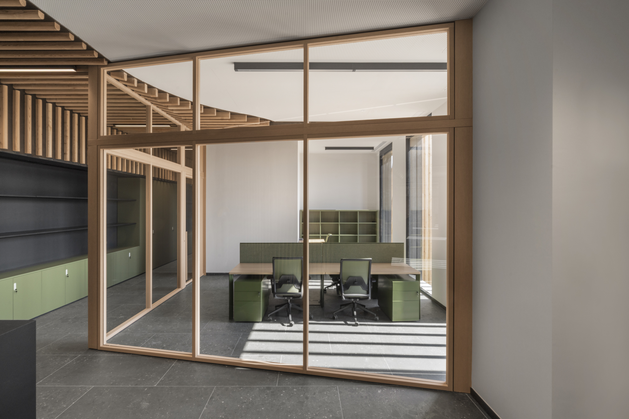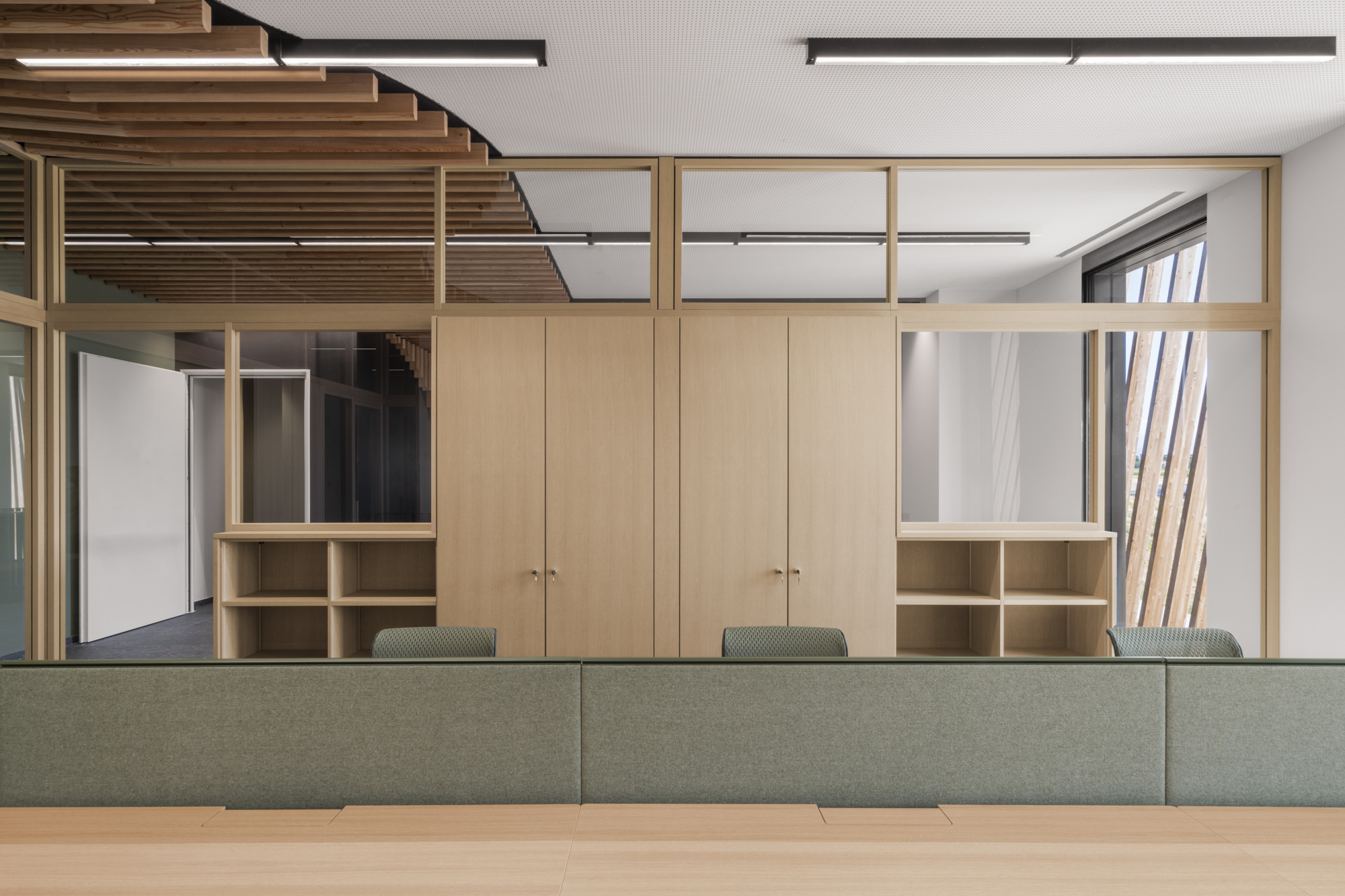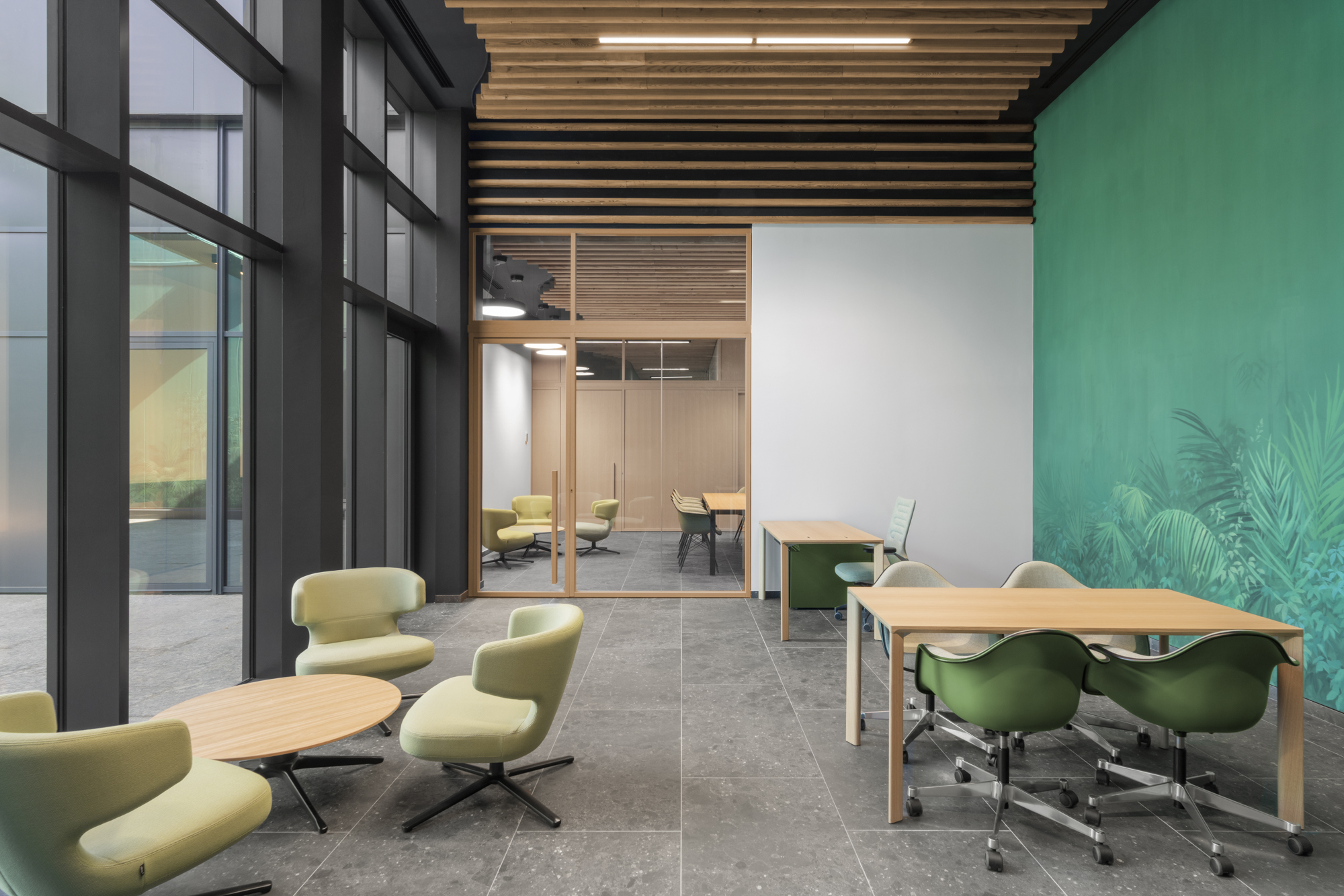 I luoghi della produzione (ugualmente divisi tra crescita, raccolto e logistica) sono localizzati al piano terra, circa 10 metri di altezza interna. Sopra c’è un altro livello, ospita gli eleganti, e ordinatissimi, ambienti per gli uffici: geometrie di legno, partizioni vetrate, tessuti verdi. Sono stati disegnati da UniFor, il cui amministratore delegato Carlo Molteni racconta: “Il nostro obiettivo era creare spazi che non fossero solo operativi, ma che rispecchiassero anche l’identità di Planet Farms, unendo l’efficienza alla bellezza”.