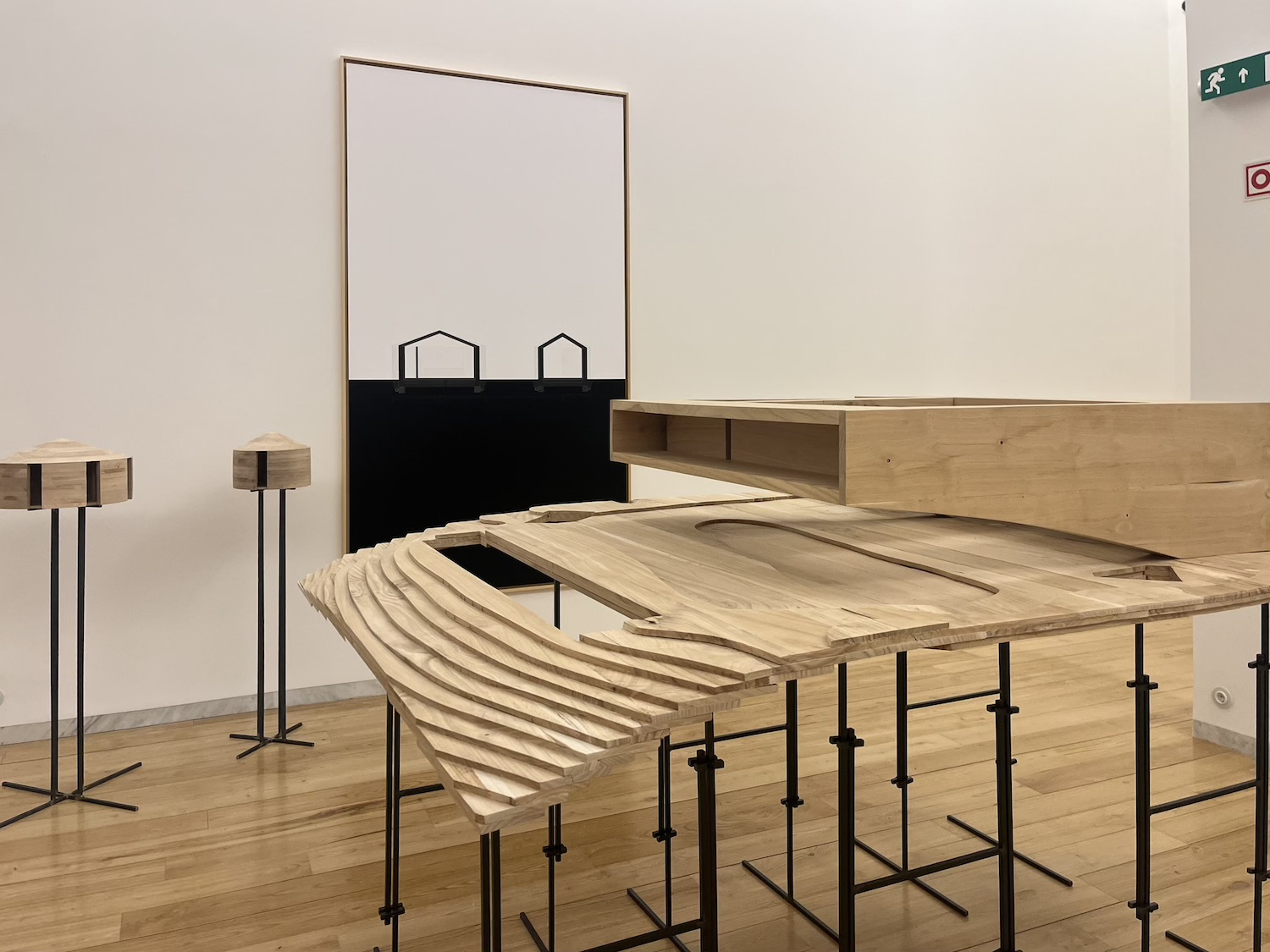 L’allestimento si articola in due momenti: un primo nucleo introduttivo e quello principale, nella Sala do Capítulo, dove una struttura cruciforme, realizzata con legni da casseri ricalca il diagramma classico dei 4 elementi e organizza cronologicamente i processi di relazione tra autori, istituzioni e territorio. Quattro video sospesi — realizzati da Orlando Franco, Miguel Marquês e Oleksandr Lyashchenko — dialogano con le tavole e i materiali di lavoro, mentre la croce espositiva riflette in modo sorprendente la distribuzione geografica reale dei 4 progetti nel paese.