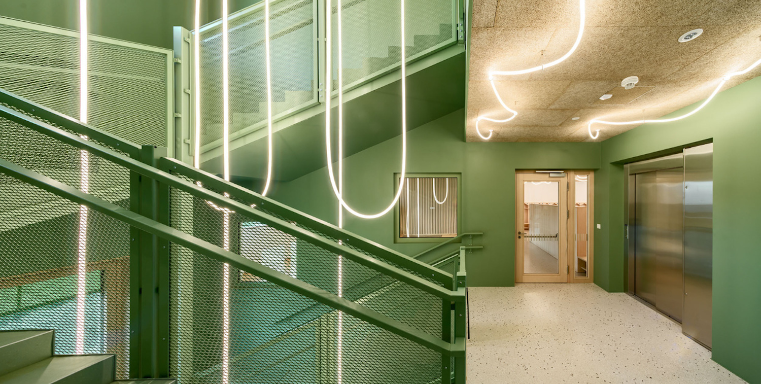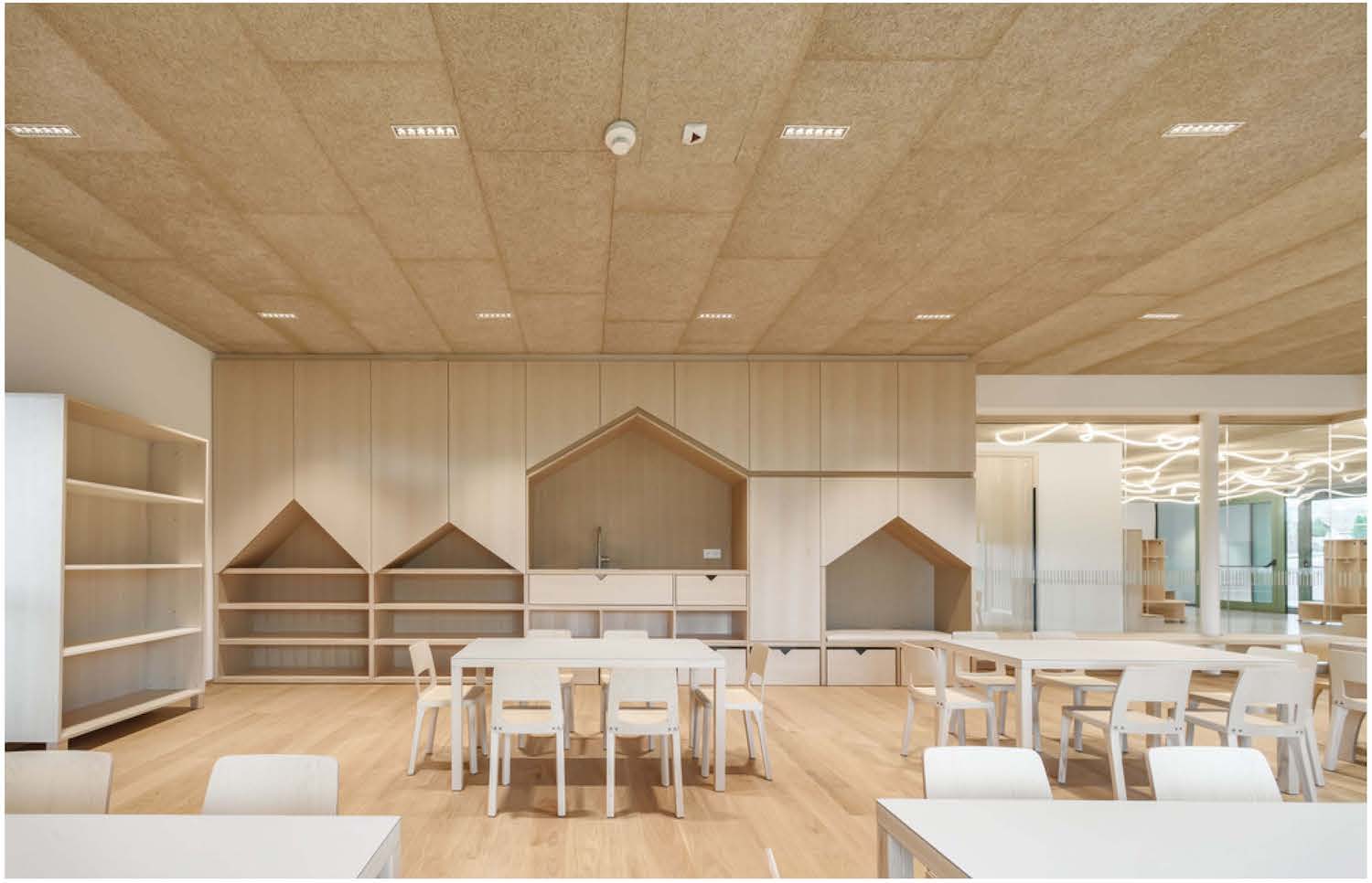 Il basamento in calcestruzzo ancora il complesso al pendio; sopra, i due piani fuori terra interamente in legno ospitano gli spazi pedagogici: sequenze di aule e spazi comuni, punteggiate da nicchie, isole di incontro e piccole zone che consentono ai bambini di scegliere ogni volta una modalità diversa di stare nello spazio. Le facciate in legno verniciato di verde, visibili a distanza, dichiarano il ruolo del complesso come nuovo landmark all’ingresso del paese, mentre all’interno l’uso diffuso del legno neutro, la luce naturale e la continuità fra ambienti aperti e chiusi costruiscono un’atmosfera calma e domestica.