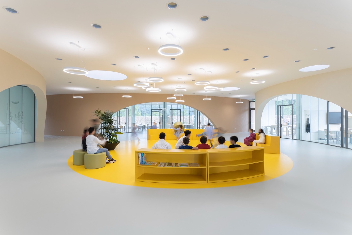 Il cuore distributivo è un’agorà a doppia altezza, attraversata dalla luce zenitale e affacciata su un soppalco più raccolto; è qui che la scuola si mostra come infrastruttura collettiva, capace di accogliere attività miste, laboratori, incontri con le famiglie, micro-eventi. Sul lato sud si dispongono le 4 sezioni, concepite come unità autonome ma permeabili, con grandi superfici vetrate, lucernari e logge coperte che proiettano le aule verso il giardino e permettono una didattica che alterna senza soluzione di continuità interno ed esterno. Le aule sono collegate fra loro da uno spazio flessibile pensato insieme come atelier e luogo del riposo, un corridoio abitato che supera l’idea di distribuzione pura per diventare un’estensione delle attività educative.