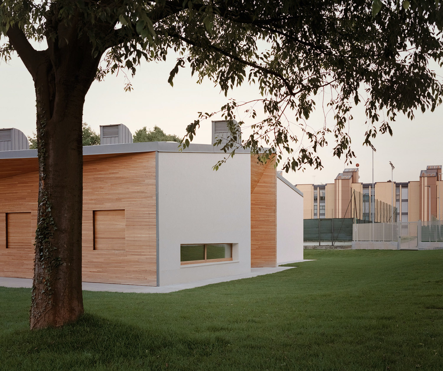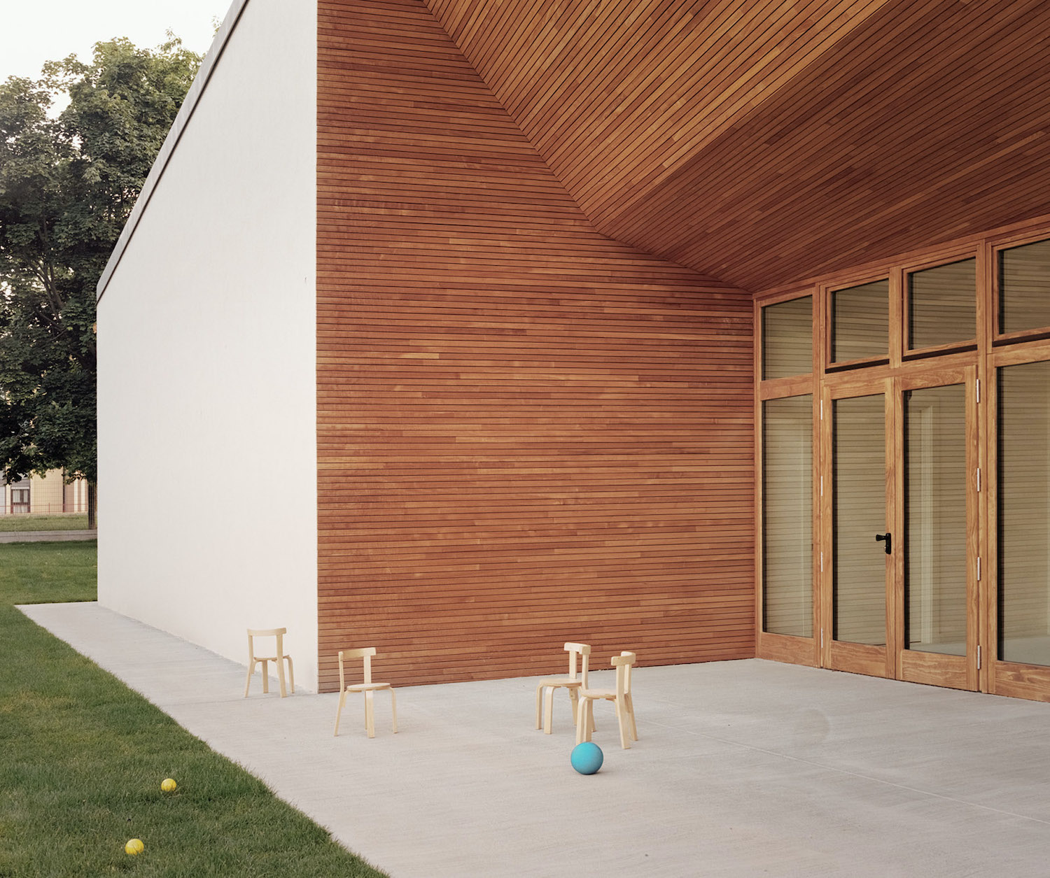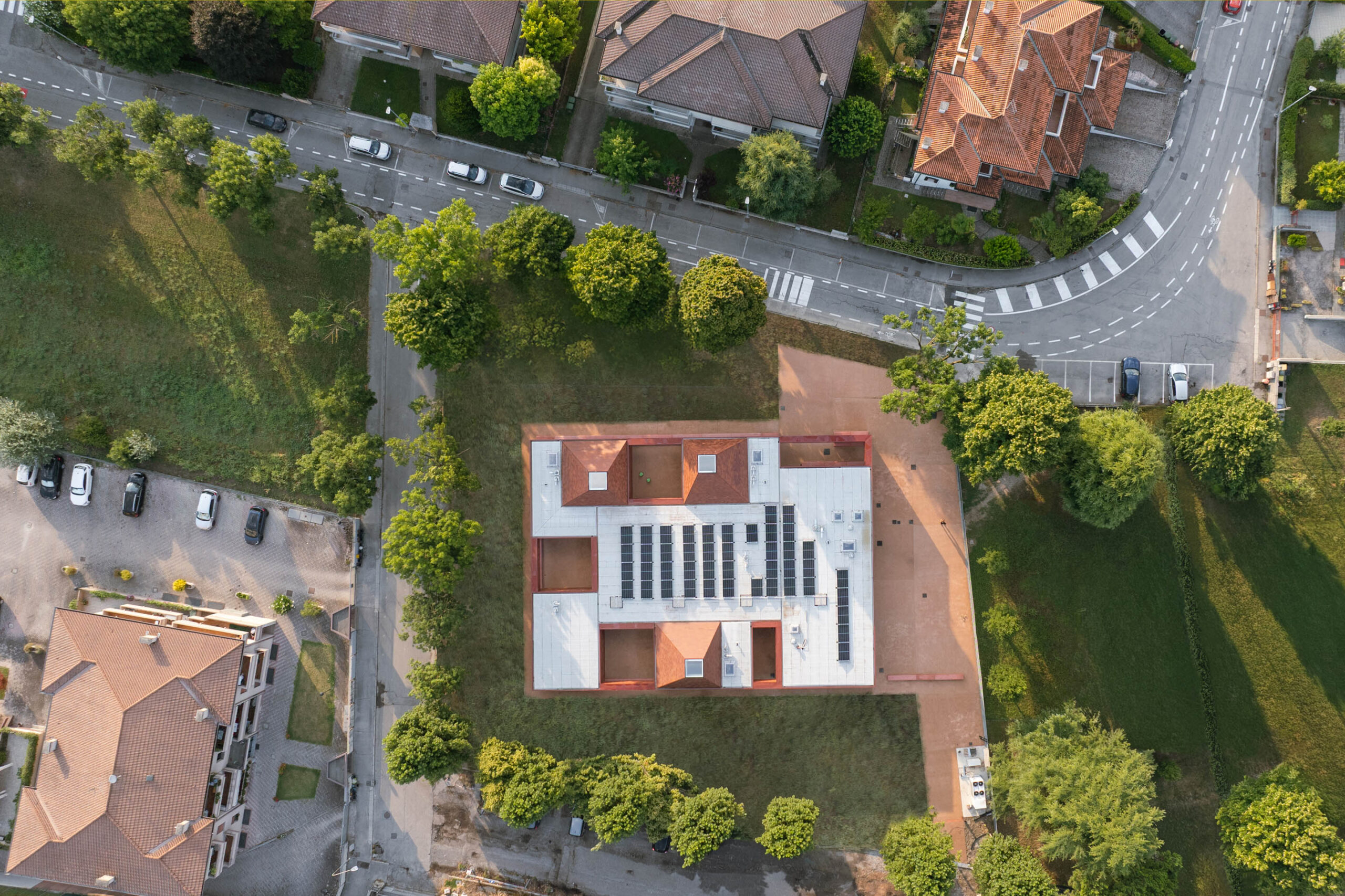 A Piove di Sacco, AACM – Atelier Architettura Chinello Morandi – lavora sull’idea di un asilo primordiale, un piccolo villaggio astratto in cui il bambino possa riconoscere forme semplici e rassicuranti. Il complesso, infatti, si compone di una costellazione di volumi piramidali, tre dei quali corrispondono alle aule, raccolti entro un unico involucro continuo in laterizio e tegole che reinterpreta l’archetipo del casone veneto.