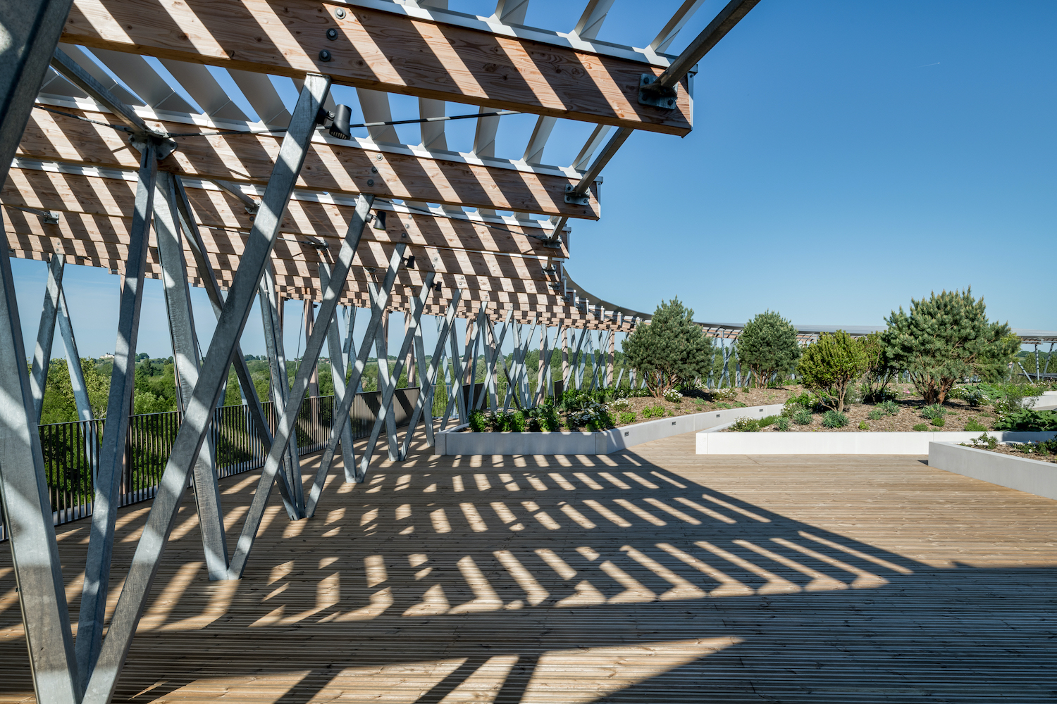 Nell’attico, la logica costruttiva dei piani inferiori muta radicalmente privilegiando strutture in legno. Qui la terrazza superiore è parzialmente occupata da un volume a granaio destinato alla direzione, alla sala del comitato esecutivo, alla biblioteca e a un piccolo ristorante vip, il tutto organizzato secondo una trama strutturale concentrica che ne definisce gli usi. L’idea del boschetto si esprime qui attraverso strutture concentriche esterne in legno e metallo che fungono da frangisole sui giardini e sulle terrazze in copertura. Questi spazi sono accessibili dal patio attraverso terrazze annidate attorno alla grande piazza interna e scale che disegnano un percorso circolare panoramico fino al tetto. Da questo belvedere si scorge all’orizzonte il Tertre de Fronsac, una particolarità geologica circolare e boscosa a cui l’edificio rende omaggio e riferimento.