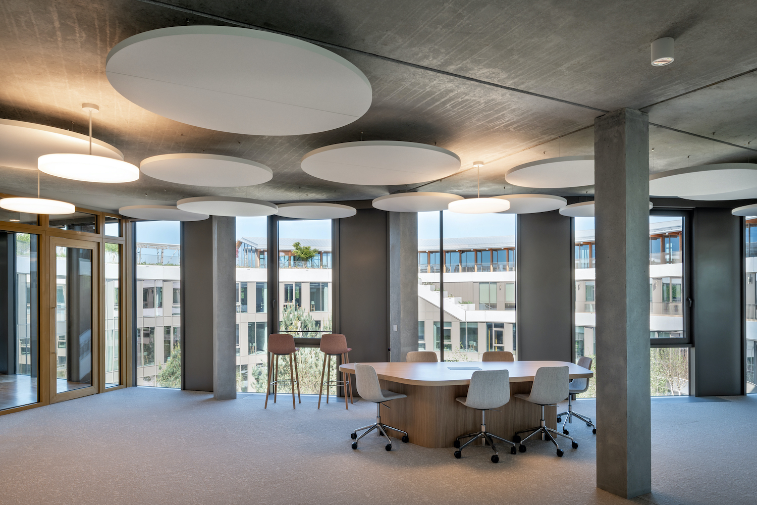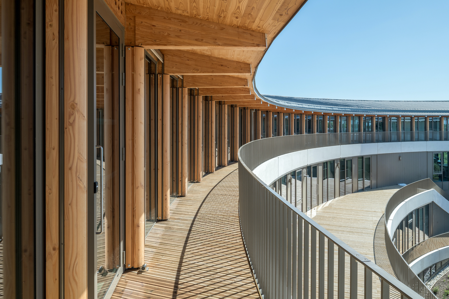 Oltre alla qualità della pianta che intreccia le figure del cerchio e del quadrato, merita attenzione la cura esecutiva dei dettagli affidata a imprese locali della Nuova Aquitania, dai pilastri organici in legno accoppiato con lama metallica fino agli allestimenti interni. La facciata spessa integra i sistemi di protezione solare e manutenzione, mentre la corolla esterna sostiene la carpenteria in legno lamellare coperta da un tetto in zinco a sbalzo. A mezza altezza, un grigliato metallico asseconda la curvatura della facciata per ottimizzare la schermatura solare. Questa superficie, ampiamente vetrata, mette in scena la trasparenza verso l’atrio e gli spazi comuni, mentre ai piani superiori porzioni piene in alluminio con aperture mobili riequilibrano il comfort termico e visivo. I camminamenti esterni sul patio e le terrazze offrono inoltre ricche prospettive visuali e agiscono come spazi di respiro e incontro.