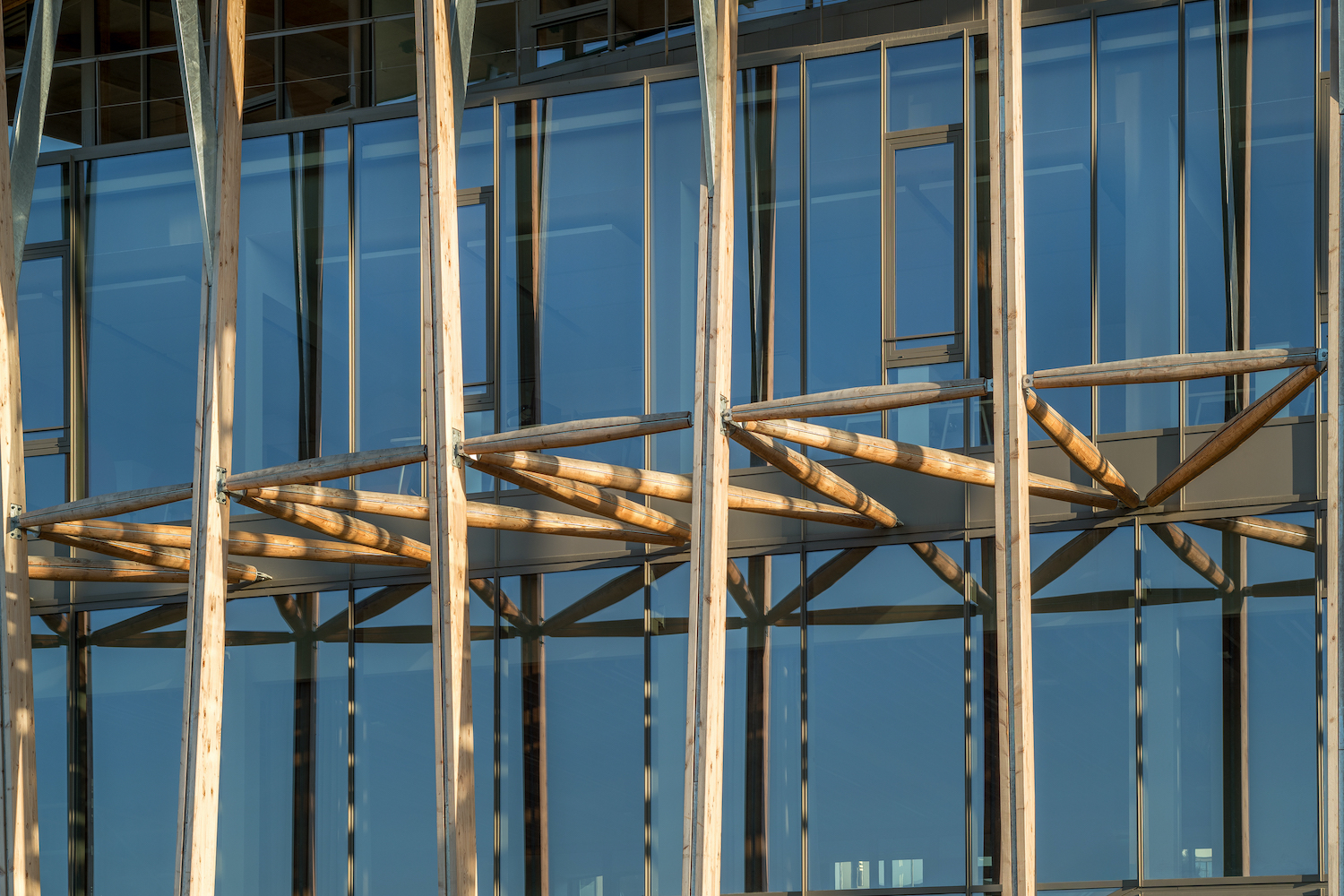 Pilastri, setti e solette sono in cemento armato materiale che garantisce una forte inerzia termica utile a ridurre i consumi per la climatizzazione, mentre un pavimento flottante di 50 cm ospita le reti elettriche e le travi fredde necessarie al comfort ambientale. In questo scrigno naturale, l’impiego di materiali durevoli e biosorgenti, unito all’ottimizzazione di risorse rinnovabili come la geotermia e il recupero delle acque piovane, risponde alle attuali sfide ecologiche. Il legno a basso impatto carbonico è declinato in tutto il complesso: dal lamellare di Douglas per le facciate, proveniente da foreste gestite in modo sostenibile, alla carpenteria, fino ai rivestimenti interni e ai pannelli acustici in lana di legno d’abete. La presenza di 4.500 mq di pannelli fotovoltaici sulle coperture dei parcheggi copre l’intero fabbisogno elettrico della sede. Gli allestimenti esterni utilizzano materiali geosorgenti, come pavimentazioni in pietra calcarea e argilla con giunti inerbati per assicurare la permeabilità del suolo, mentre gabbioni in pietra frantumata sostengono il percorso verso il lago. Infine, il paesaggio rivisitato attraverso numerose piantagioni e nicchie ecologiche contribuisce alla diversificazione del biotopo e al miglioramento della qualità della vita degli utenti.