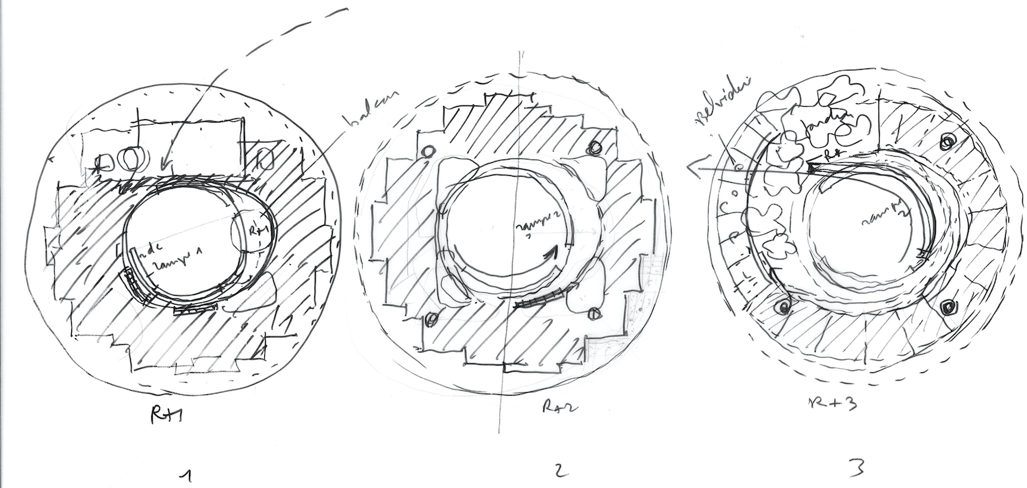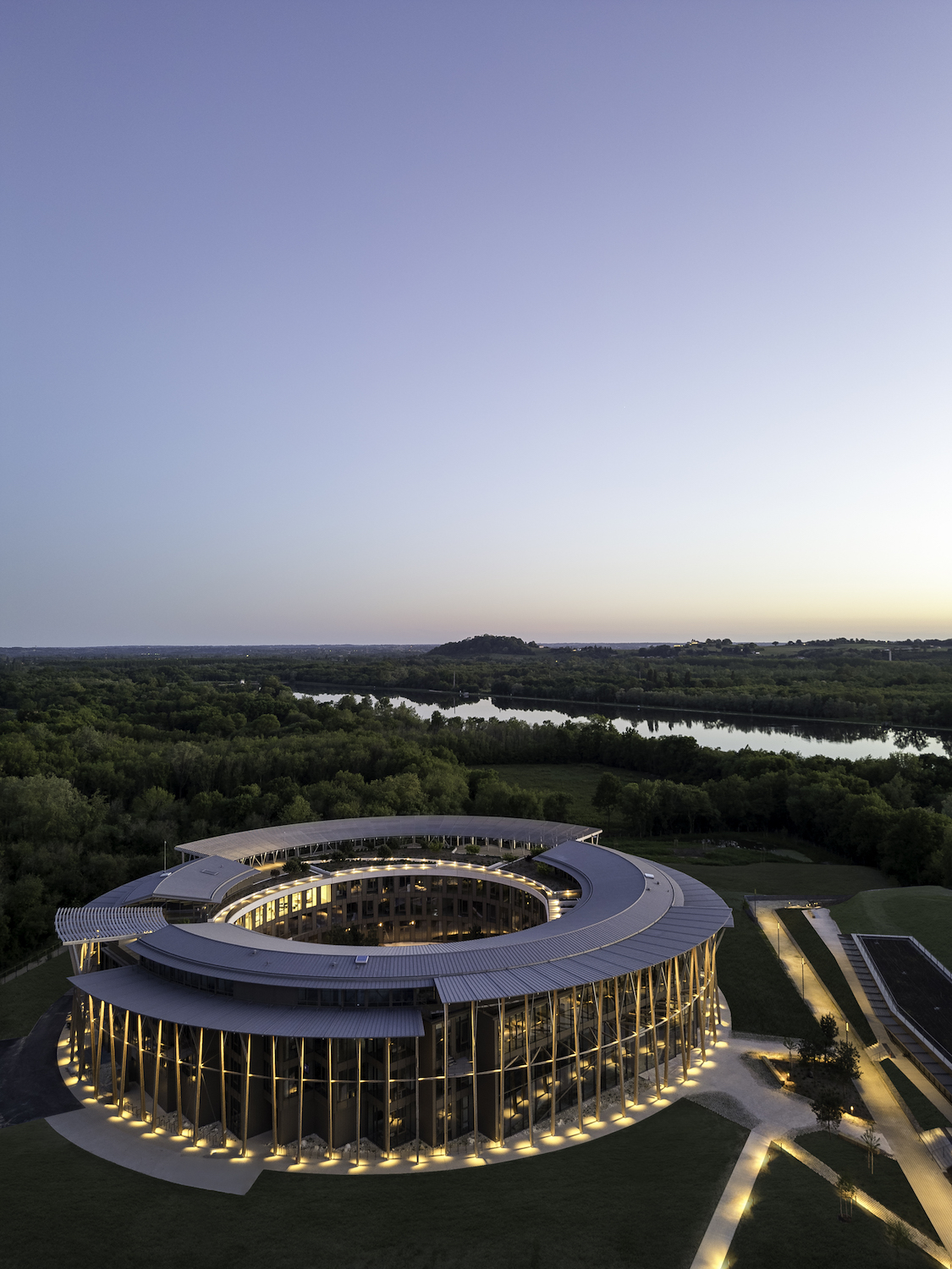 Sviluppandosi su tre livelli, un cerchio cinge il perimetro dell’edificio per delineare una “facciata-filtro” ritmata da pilastri organici in legno e metallo che compongono un peristilio. Strutture ombreggianti e reti metalliche rivestono e proteggono questa superficie, generando una facciata vetrata sfaccettata che permette l’inserimento di uffici individuali a corolla, modulari e riconfigurabili. Il cerchio interno definisce invece la superficie liscia del patio circolare, che ospita spazi comuni condivisibili aperti verso l’esterno. Una maglia strutturale di 5,4 per 5,4 metri organizza i piani polivalenti, la cui flessibilità accoglie ambienti di vita e di lavoro confortevoli, tra uffici individuali o nomadi, aree lounge e spazi di concentrazione. Caratterizzato da una trasparenza vetrata alta quattro metri che dialoga con l’esterno e il patio, lo zoccolo del piano terra riunisce le funzioni collettive, come l’anfiteatro, il ristorante aziendale e la portineria, oltre agli showroom che fungono da vetrina attiva per le sperimentazioni e le strumentazioni di questo ecosistema.