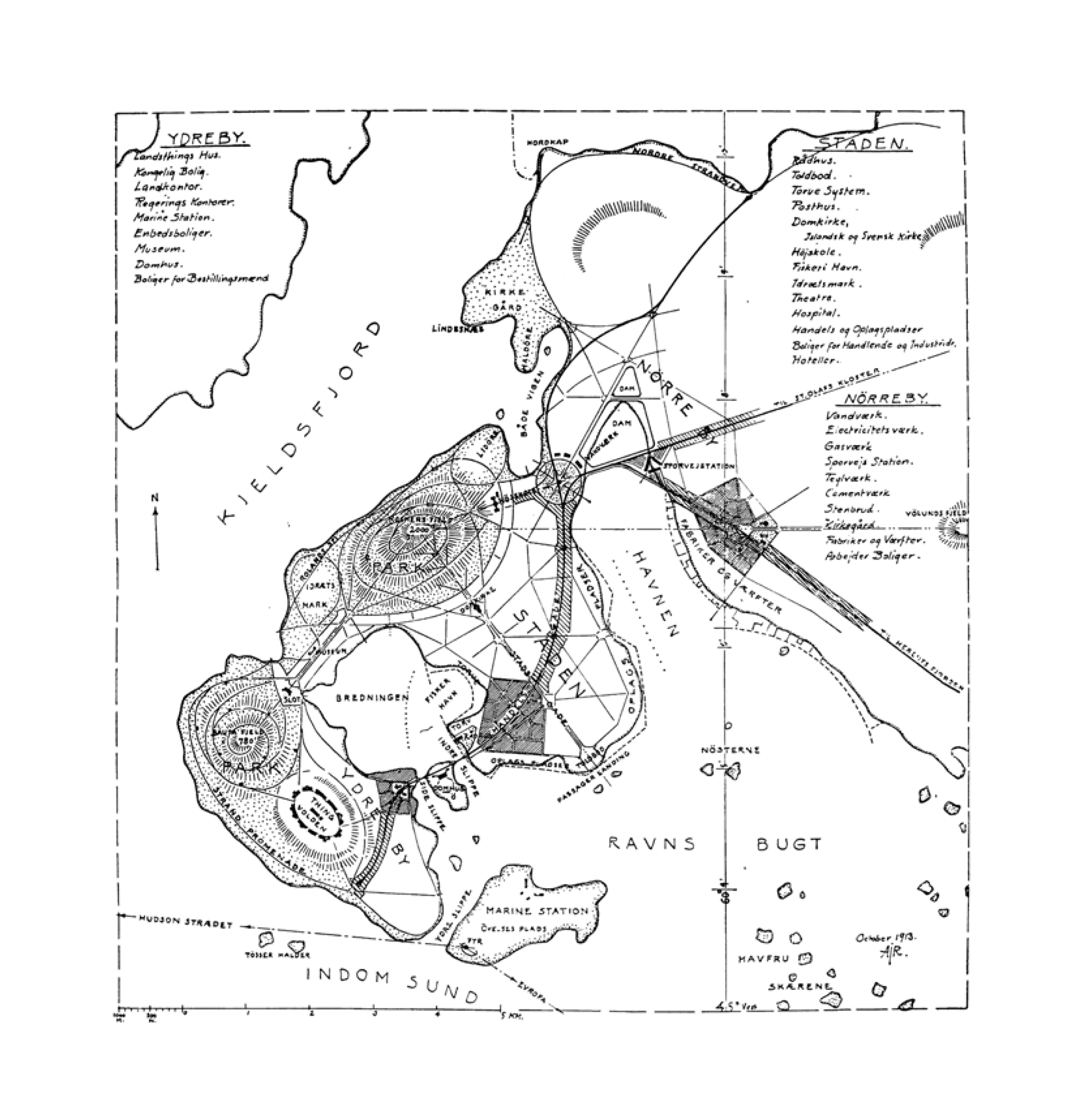 Per ovviare a tale condizione l’unica soluzione sarebbe stata quella di aumentare il proprio peso geopolitico trasferendone l’asse baricentrico lontano dall’Europa, pur continuando a mantenere una popolazione europea (l’auspicio era di raggiungere i 100.000 abitanti entro gli anni Cinquanta). La capitale, Erikshavn – che si sarebbe dovuta costruire nell’area meridionale dell’isola – sarebbe stata una città moderna ispirata ai principi del City Beautiful, con settori governativi, commerciali, residenziali ed industriali. Il quartiere governativo, Thingvolden (Collina del Parlamento), sarebbe stato edificato in posizione prominente sulla sommità di una collina, in evidente richiamo ai grandi spazi per adunate tipici dell’antichità scandinava (come Thingvellir in Islanda) mentre il sistema viario sarebbe stato informato da viali e strade all’europea, con parchi e un sistema elettrico-tramviario che avrebbe collegato i diversi quartieri e l’entroterra dell’isola.