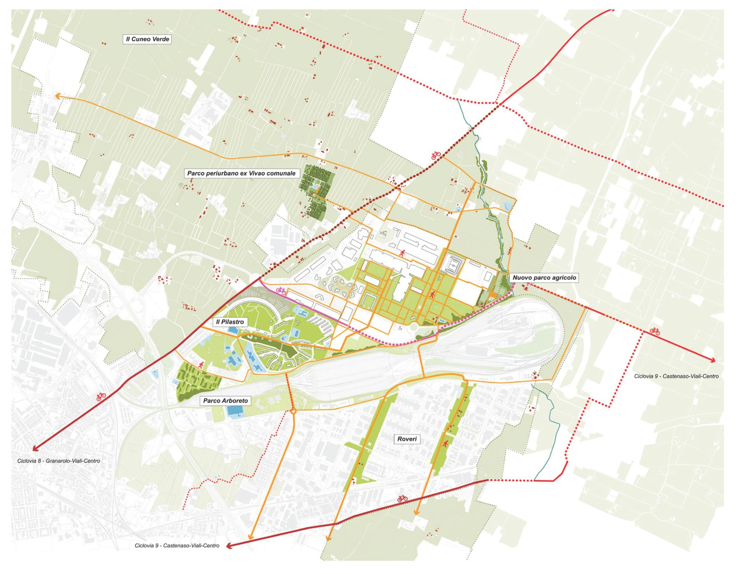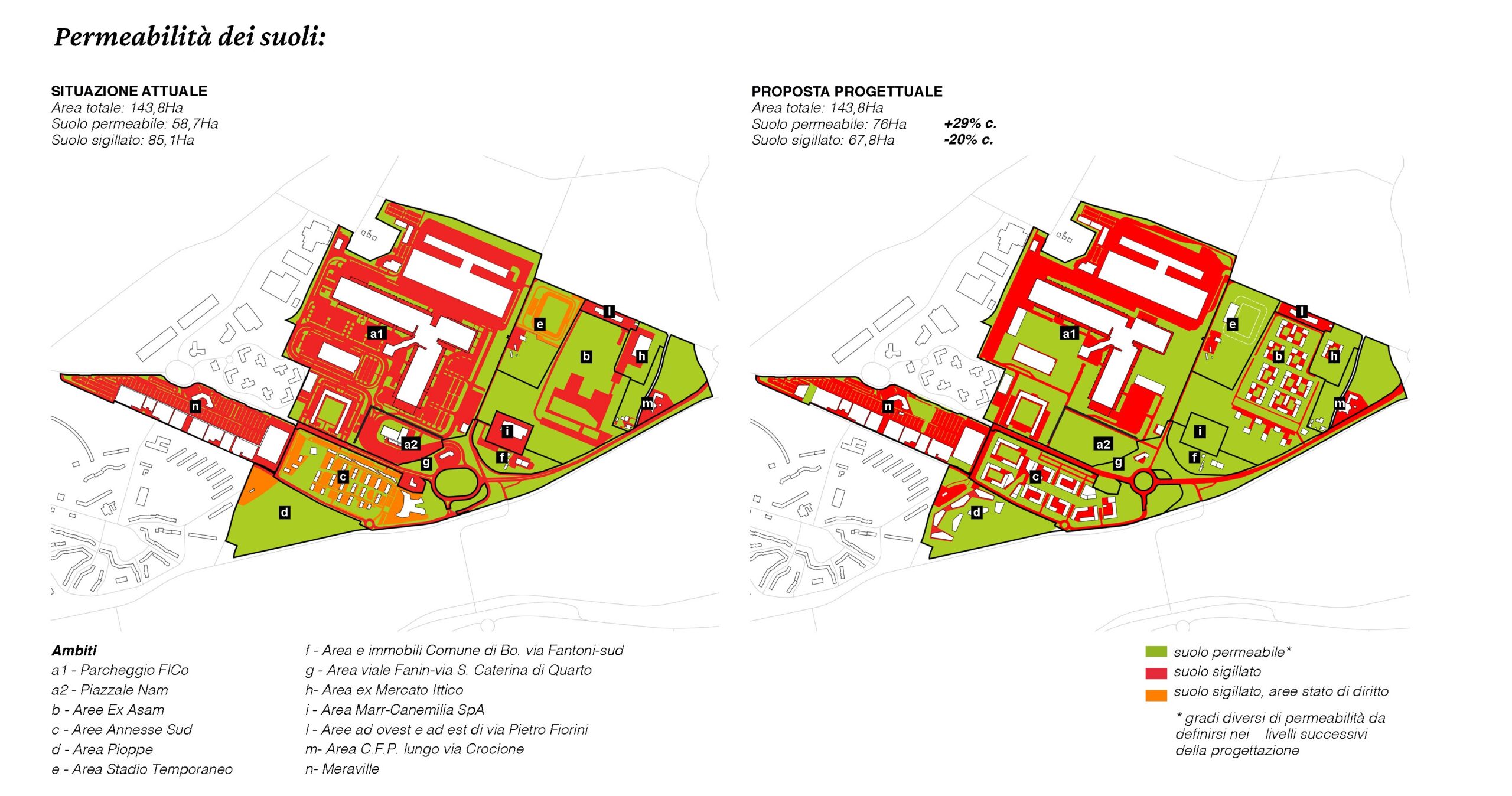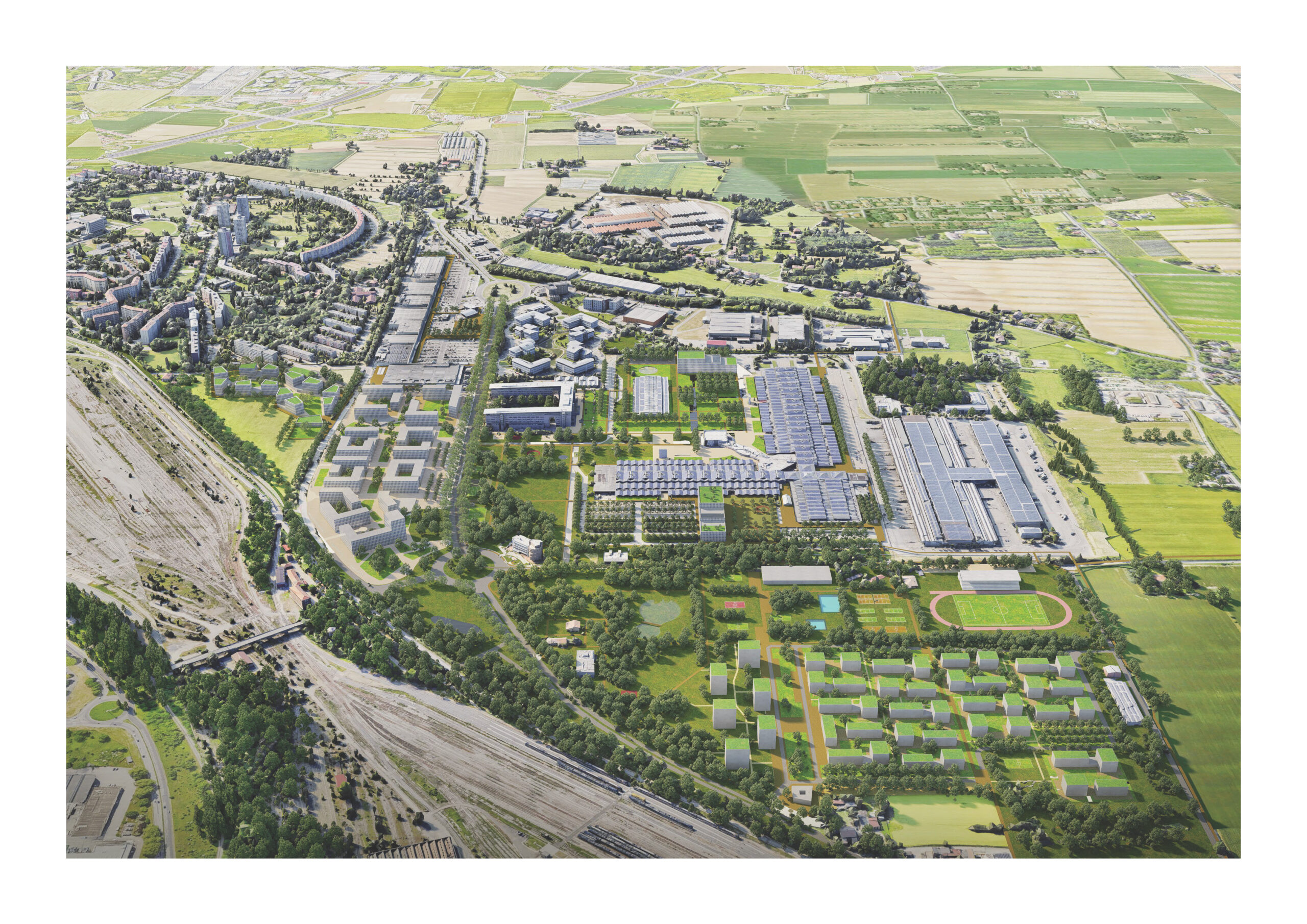 La volontà di confrontarsi con le questioni ambientali si è tradotta nel masterplan in una straordinaria opera di desigillazione (circa 17 ettari, sui complessivi 143,8 del progetto, destinati a parchi e giardini diversamente caratterizzati e raccordati con i lembi del paesaggio rurale), resa possibile dalla revisione complessiva del sistema di mobilità e sosta (automobilistica, con trasporto pubblico, ciclabile), sia per accedere al distretto da Bologna e dall’area metropolitana sia al suo interno.