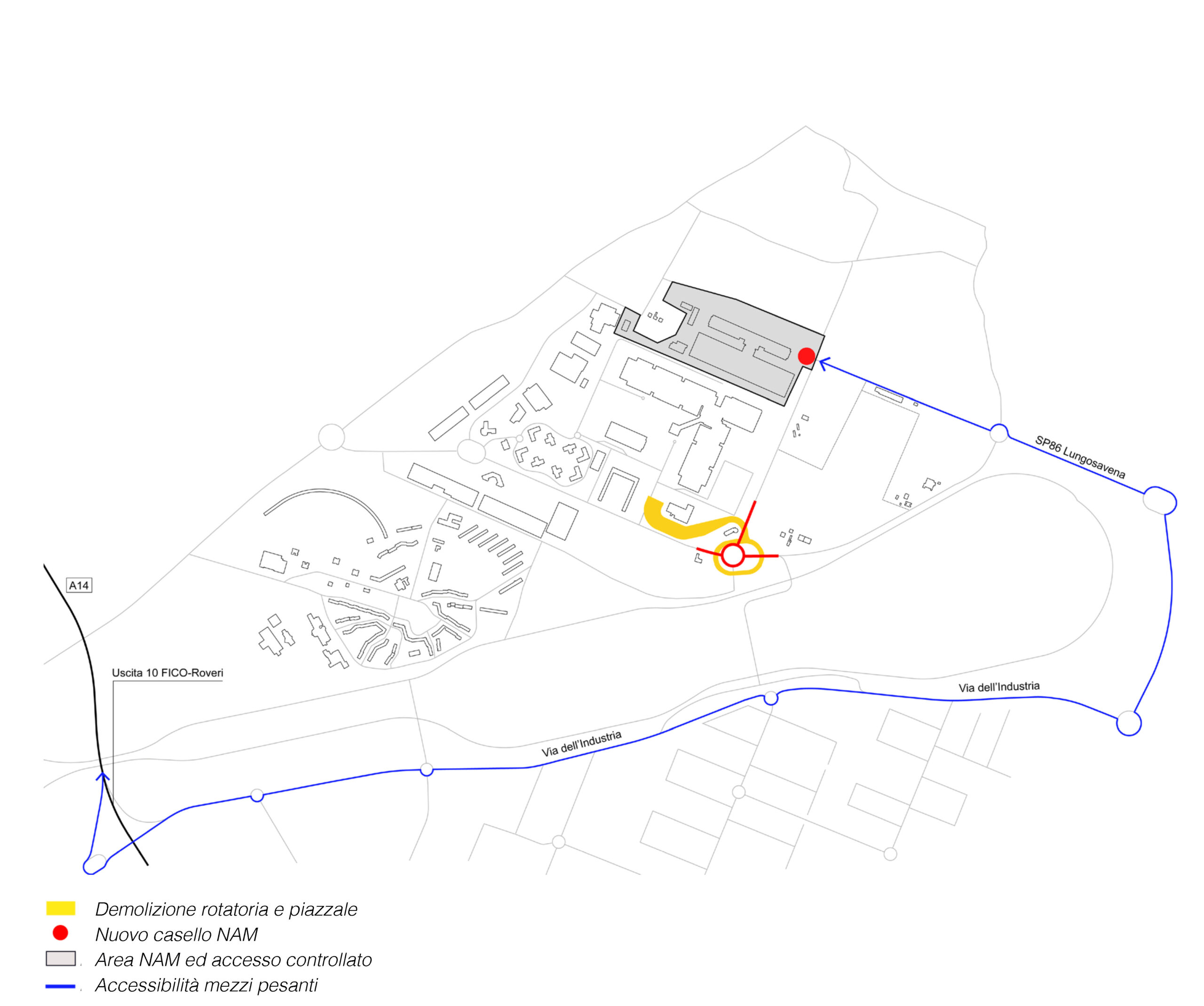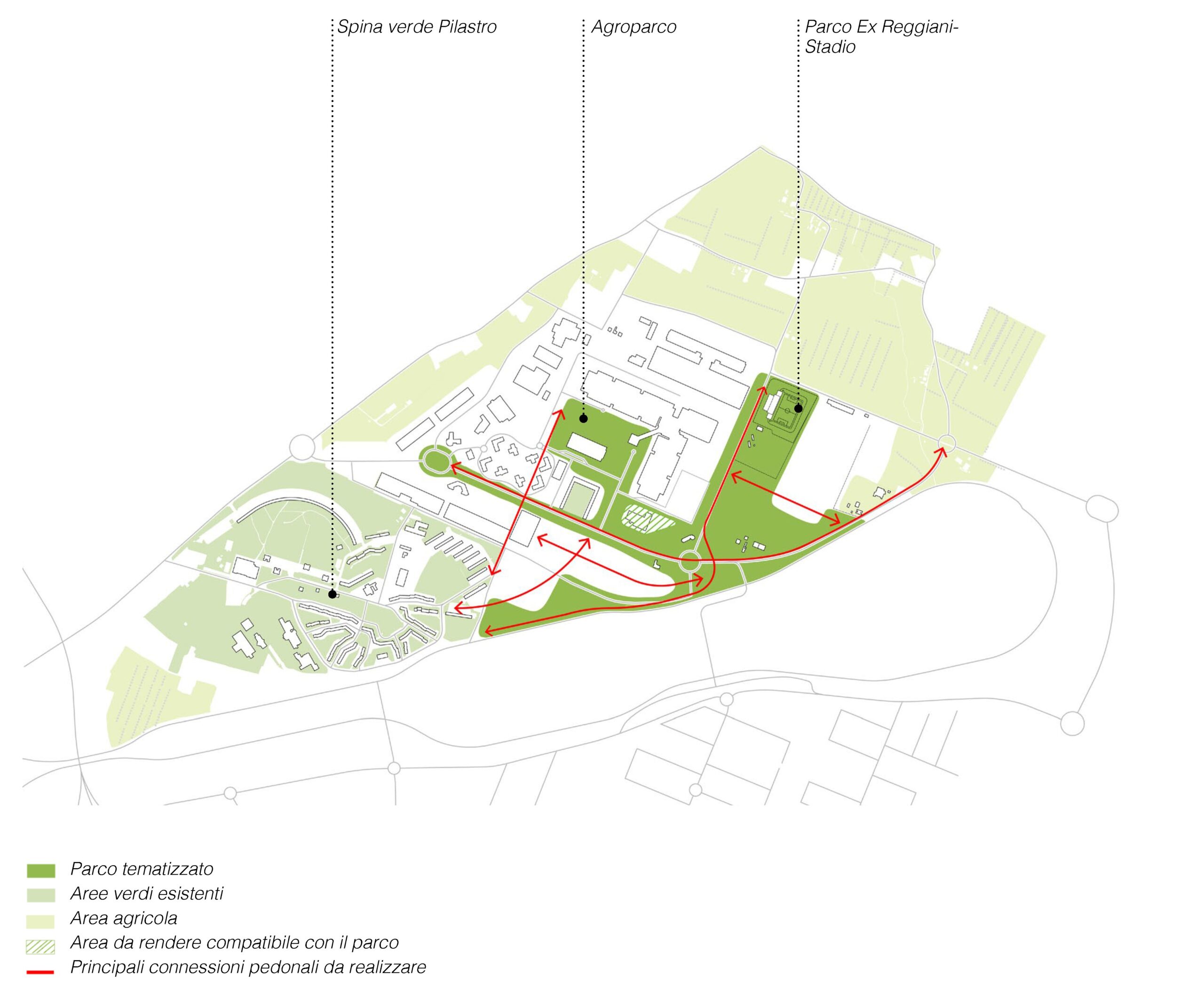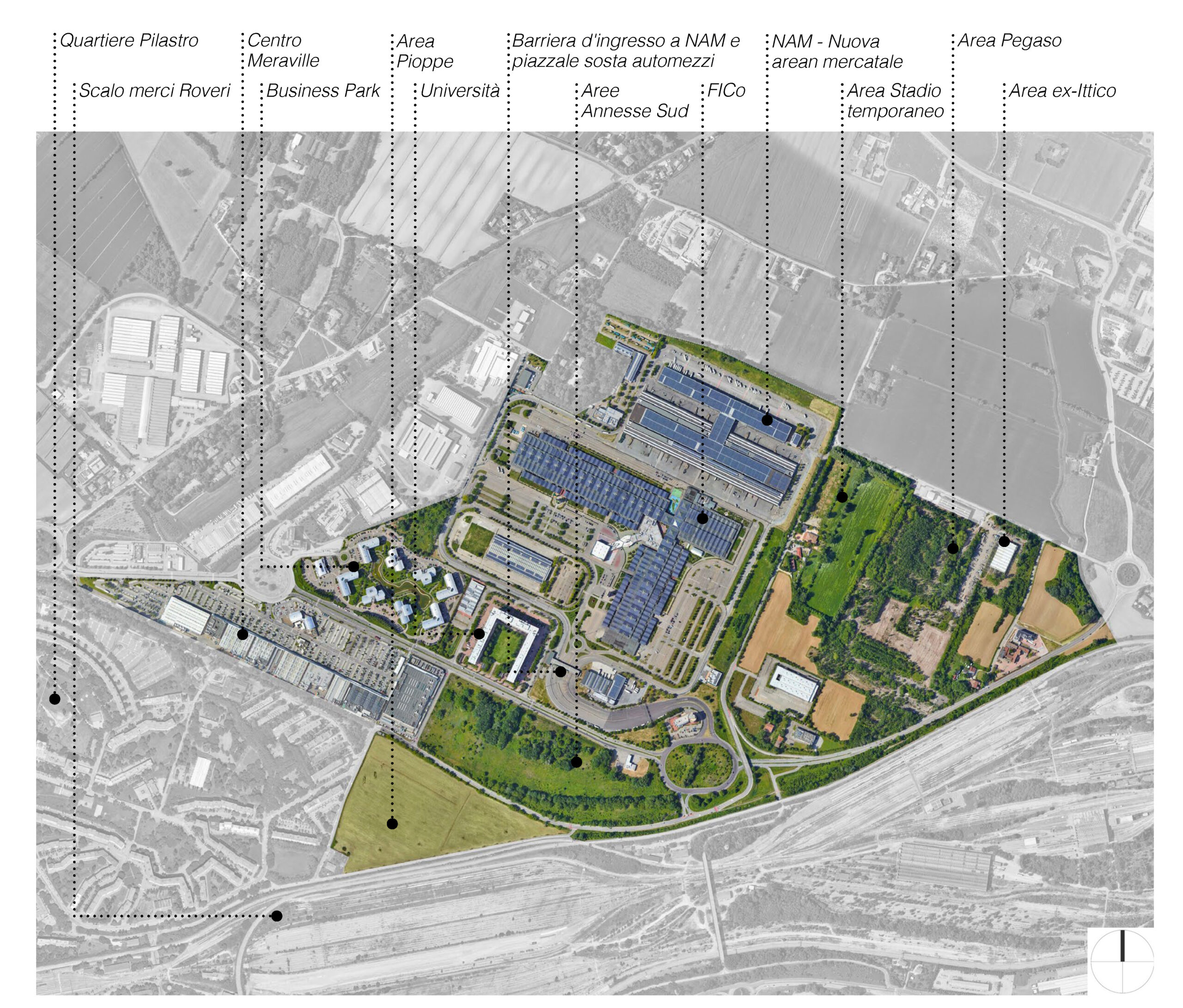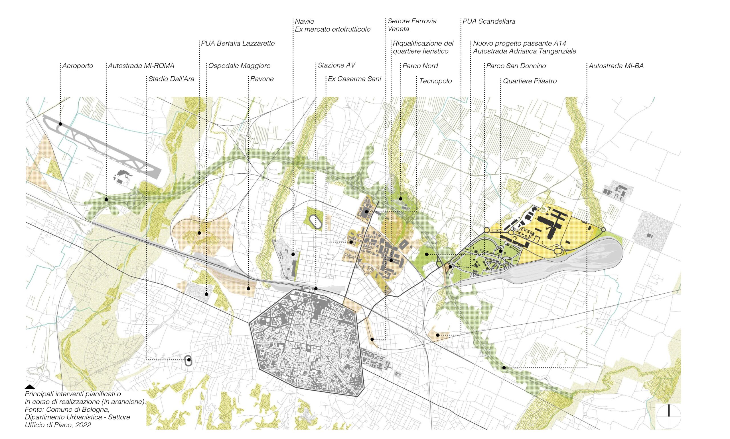 La possibilità di rivedere il ruolo di quel settore cercando di affrontarne le criticità entro una esplicita strategia territoriale era data dal sommarsi di alcune previsioni: le opere di mitigazione connesse al Passante autostradale e l’arrivo del tram al Pilastro, la decisione di realizzare accanto alla NAM uno stadio provvisorio per consentire la ristrutturazione del Dall’Ara, la disponibilità dei proprietari delle aree ex ASAM e dei gestori del fondo proprietario delle Aree Annesse sud di rivedere le destinazioni d’uso e l’assetto previsti dagli strumenti attuativi vigenti.