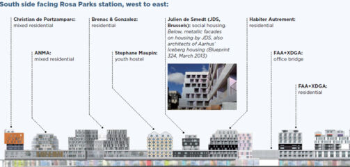 Progetti residenze (74.000 mq di cui il 50% a carattere sociale): F. Alkemade, X. De Geyter, C. de Portzamparc, N. Michelin, Gigon&Guyer, R. Hondelatte, M. Laport, Brenac-Gonzalez, J. de Smedt, M. Haag